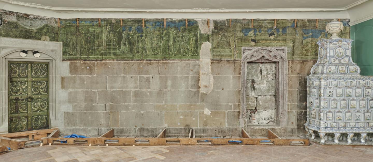 Rund vierzig Spezialistinnen und Spezialisten aus verschiedenen Fachbereichen beleuchten die Geschichte des Gebäudes und stellen die während der Bauarbeiten gemachten Entdeckungen vor, insbesondere das spektakuläre gemalte Wanddekor (1531), das hinter der Holzvertäfelung der ehemaligen kleinen Ratsstube zum Vorschein gekommen ist.