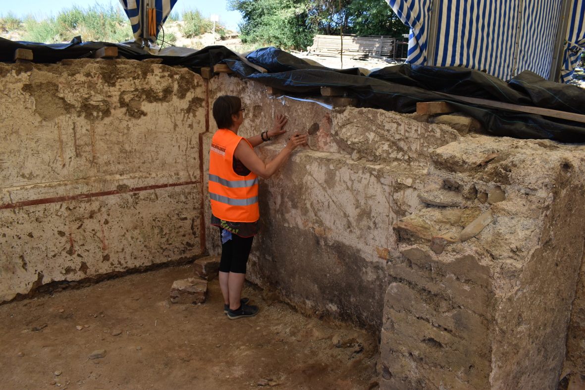 Nach den Ausgrabungen auf der ersten, oberen Parzelle, deren Ergebnisse im Mai anlässlich eines Tags der offenen Grabung vorgestellt wurden, ging die Untersuchung auf der zweiten, unteren Parzelle weiter. Dabei wurde eine Reihe von terrassenförmig angelegten Räumen freigelegt. Auf der untersten Terrasse, die tief in den Boden eingelassen ist, sind die Mauern bis zu einer Höhe von fast zwei Metern erhalten geblieben. Die fünf Räume, die in diesem neuen Sektor zum Vorschein kamen, umfassen einen 56 m2 grossen Raum mit Betonboden, der von einem kleinen Vestibül aus zugänglich ist. Letzteres führte zu einem Säulenportikus, der sich zu einem kleinen Innenhof (Gärten?) hin öffnete. Ein monumentales Wasserbecken (oder ein Brunnen) schmückte diesen Komplex