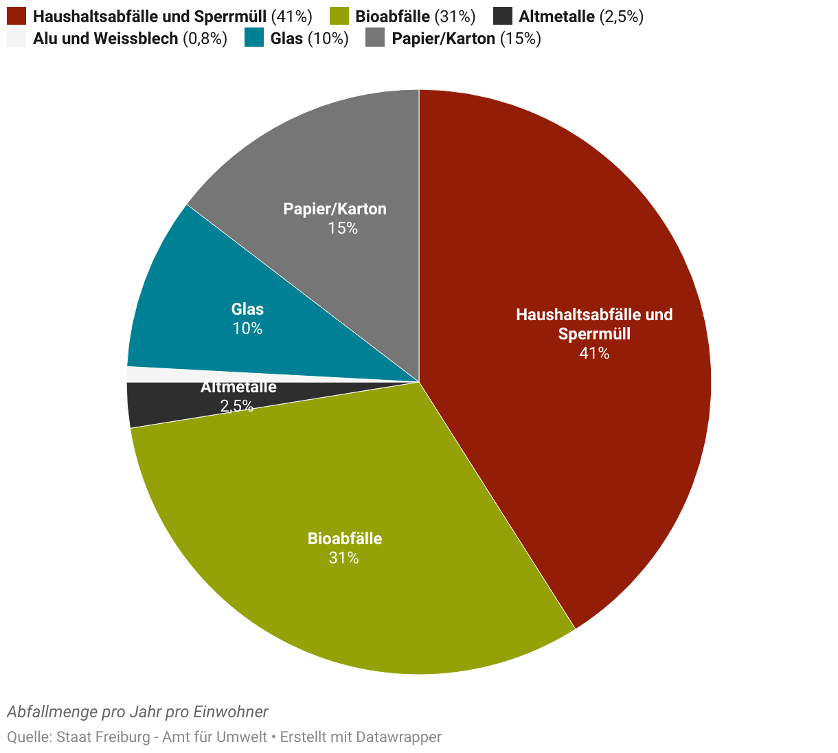 Die Hauptmasse der getrennten Siedlungsabfälle entfällt auf drei Kategorien: biogene Abfälle, Papier/Karton und Glas. Metal macht nur einen kleinen Teil der gesammelten Abfälle aus.