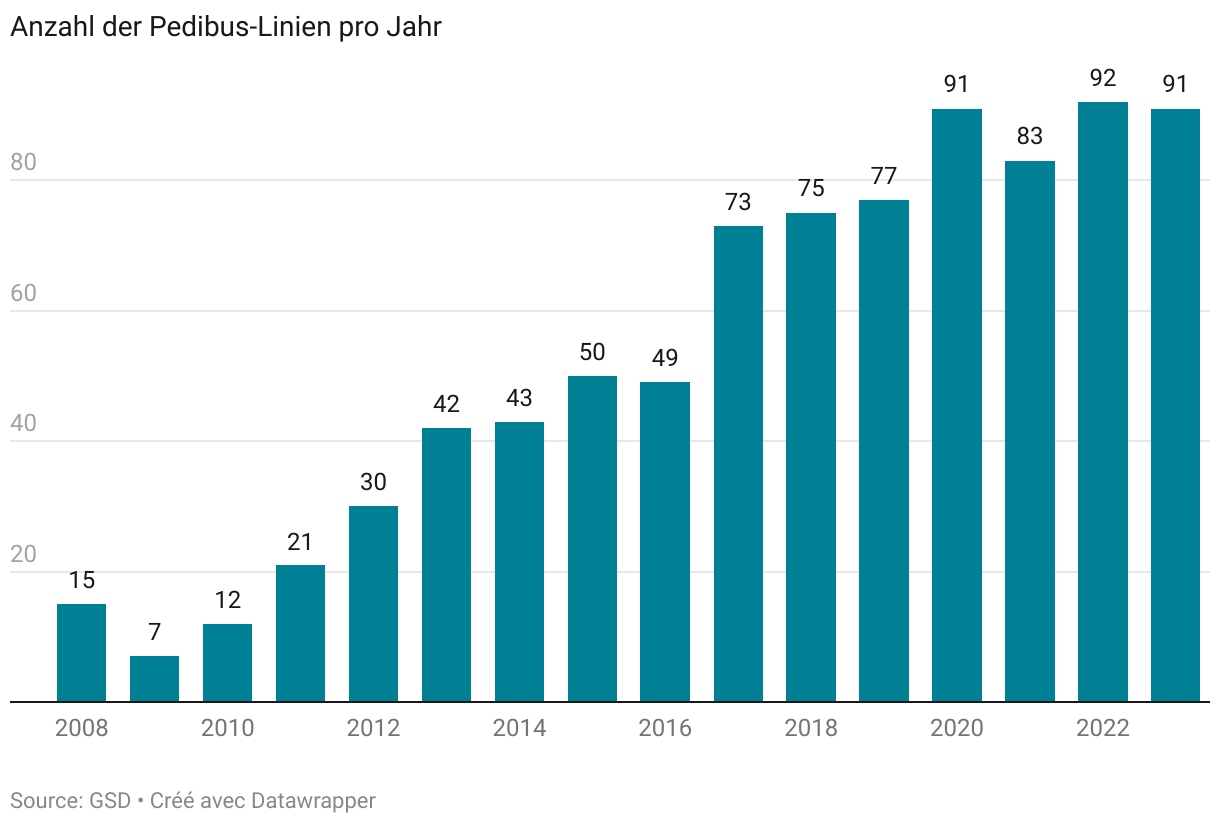 Kindern und Jugendlichen (5 bis 17 Jahre) wird empfohlen, sich täglich rund eine Stunde mässig bis intensiv körperlich zu betätigen – je mehr, desto besser. Im Durchschnitt legen die 91 aktiven Pedibus-Linien des Kantons neun Strecken pro Woche von durchschnittlich 530 Metern Distanz zurück; in einer Woche kommen so 4,1 km Fussmarsch zusammen. Teilt man diese Distanz durch die Anzahl Schultage pro Woche (4), so legt jedes Kind täglich 1 km zurück. Dies entspricht rund 30 Minuten körperlicher Betätigung. Der Schulweg bietet also eine ideale Möglichkeit, zumindest einen Teil der für Kinder empfohlenen Bewegungszeit zu erreichen.
