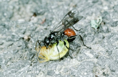 Wer unter Arachnophobie leidet, hat ab sofort eine neue beste Freundin: die Wegwespe. Als Fressfeindin ist sie der Albtraum der Spinnenarten, die sie jagt, um ihren Nachwuchs zu ernähren. Die meisten Wegwespenarten sind schwarz oder rot gefärbt und haben lange Beine. An ihrem typischen Verhalten sind sie gut zu erkennen: Sie bewegen sich hüpfend fort, und bei der Jagd vibrieren ihre Flügel stark.