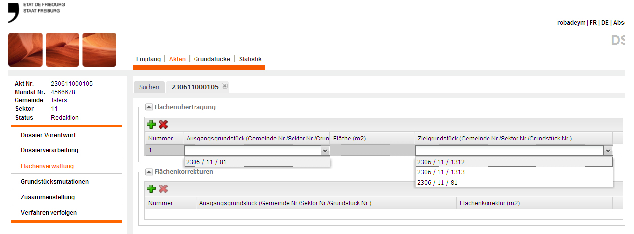 Wird die Flächenverwaltung nicht via blaue Nummern erledigt, überspringt man diese Seite. Der nächste Schritt ist die Mutation der Grundstücke (linke Seite / rechte Seite)
