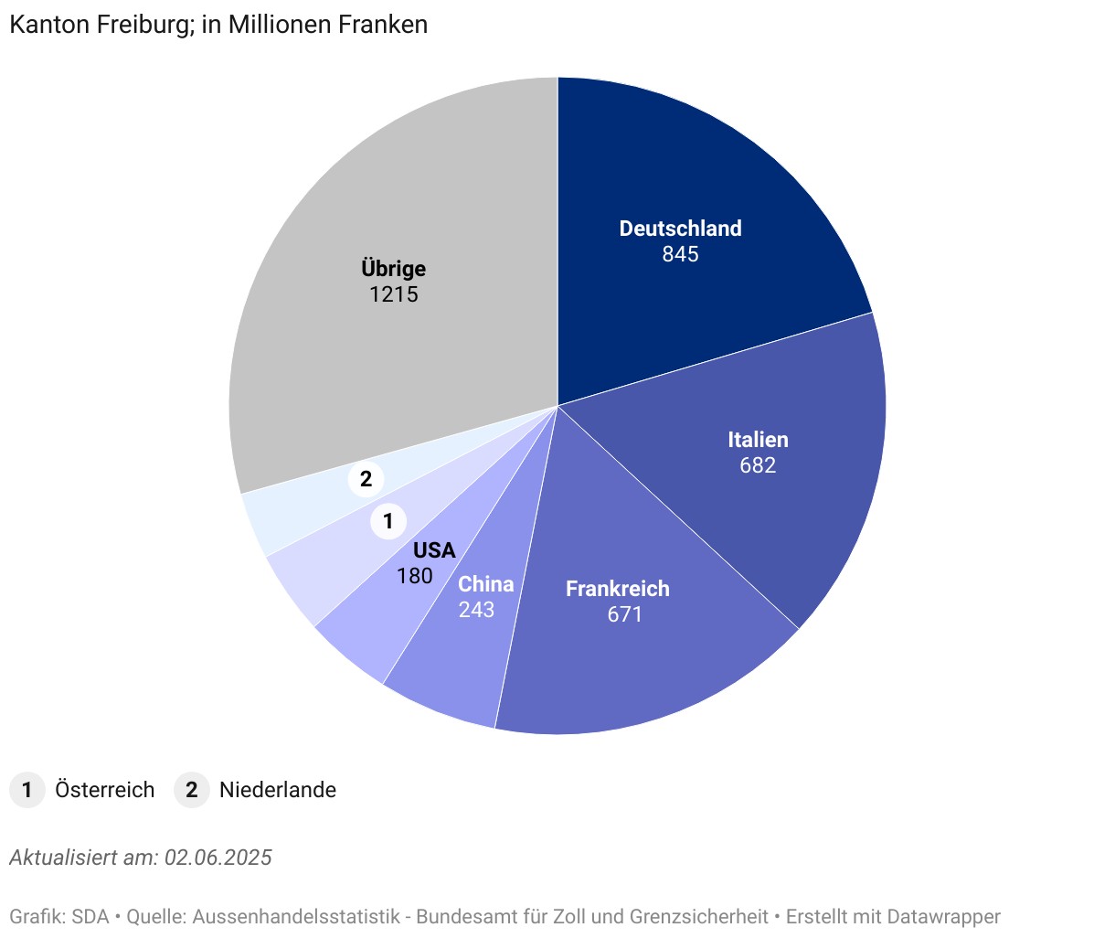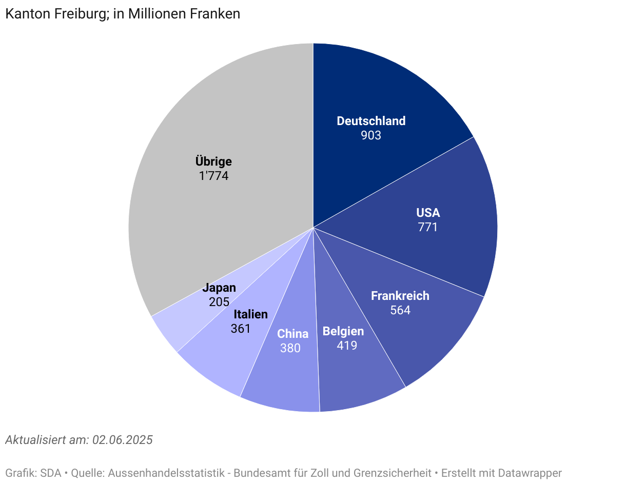 Für das Jahr 2024 belaufen sich die Warenausfuhren aus dem Kanton Freiburg auf knapp 5,4 Milliarden Franken. In einem angespannten internationalen Kontext verzeichneten die Freiburger Exporte einen leichten Rückgang von 0,7% im Vergleich zum Rekordjahr 2023. Im gleichen Zeitraum stiegen die Schweizer Exporte um 4,2%, hauptsächlich dank der Pharmaindustrie. Der Kanton Freiburg positioniert sich in der Rangfolge der Kantone mit den meisten Ausfuhren im Mittelfeld an 13. Stelle. Die Freiburger Ausfuhren machen 1,4% des Schweizer Exportvolumens aus. Die wichtigsten aus dem Kanton Freiburg exportierten Waren sind die Nahrungs- und Futtermittel (16,7% aller Freiburger Ausfuhren), die zum Vergleich nur 2,1% aller Schweizer Ausfuhren ausmachen. Im Jahr 2024 waren mehr als die Hälfte der Exporte des Kantons Freiburg für den europäischen Markt bestimmt (EU: 52,4%). Auf globaler Ebene sind die wichtigsten Handelspartner Deutschland mit einem Anteil von 16,8% und die USA mit 14,3%. Es folgen Frankreich (10,5%), Belgien (7,8%), China (7,1%) und Italien (6,7%).