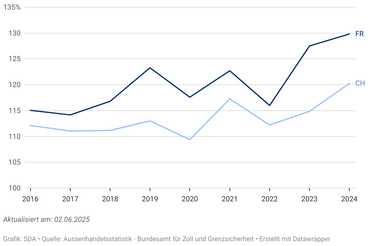 Der Deckungsgrad des Kantons Freiburg bleibt während dem gesamten Beobachtungszeitraum von 2016 bis 2024 über 100% (2024: 129,8%) und liegt auch über dem Landesdurchschnitt (2024: 120,2%). Dieses Resultat kann als positiv gewertet werden, denn es entspricht einem Handelsbilanzüberschuss, was bedeutet, dass der Kanton Freiburg mehr exportiert als er importiert. Dies kann auch bedeuten, dass die Wirtschaft einer Region sehr wettbewerbsfähig ist und dass ihre Produkte auf den internationalen Märkten gefragt sind.