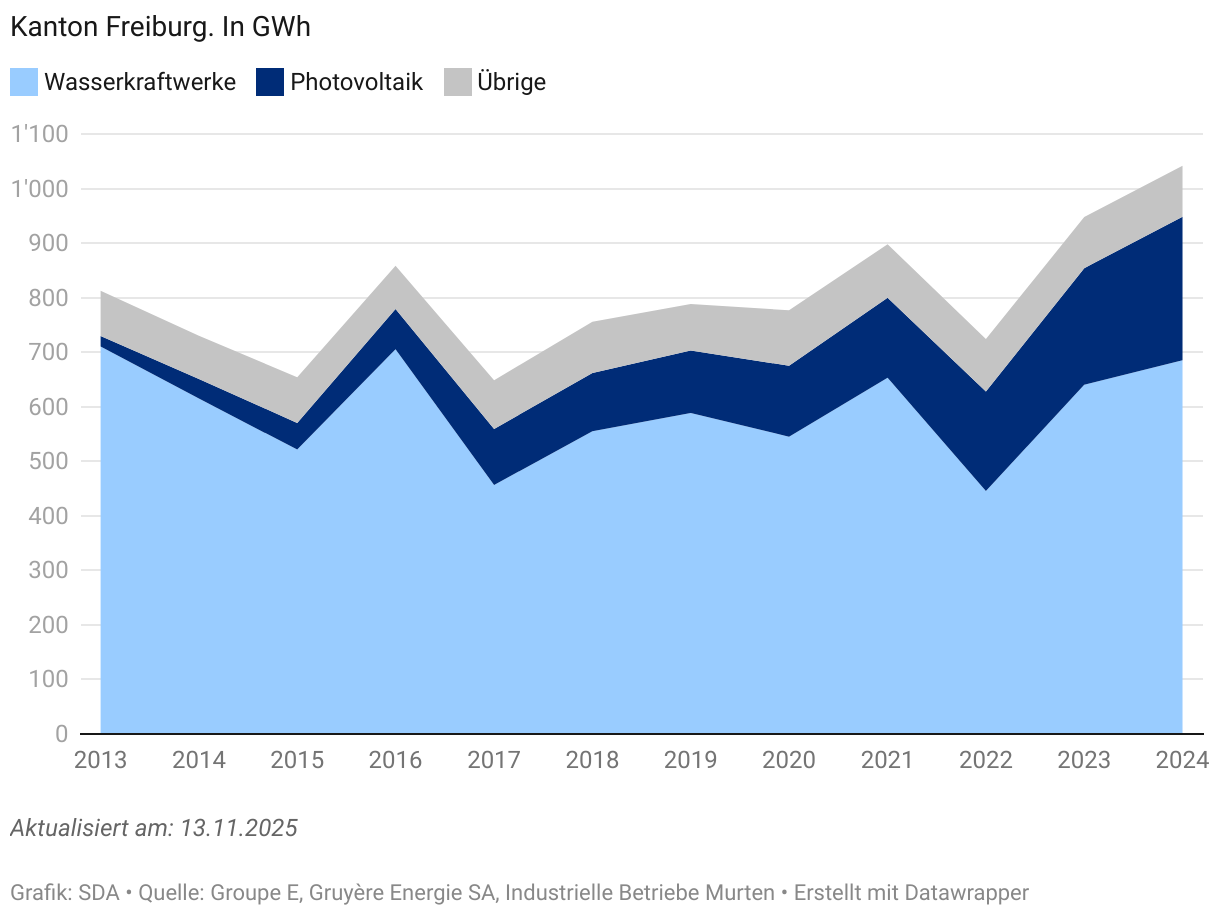 Im Jahr 2024 speisten die freiburgischen Stromversorger 1'041’743 MWh Strom in ihr eigenes Netz ein. Dies waren 9,9 Prozent mehr als im Vorjahr. Die erneuerbare Energie beträgt 1’014’179 MWh (97,4%), während die nicht erneuerbare Energie 27’564 MWh (2,6%) ausmacht. Ihr Anteil blieb zwischen 2013 (95,6%) und 2022 (95,5%) weitgehend stabil, bevor er bis 2024 auf 97,4% anstieg. Am meisten Energie produzierten die Wasserkraftwerke (65,8%), gefolgt von den Photovoltaikanlagen (25,3%). Diese Energiequelle befindet sich in rasantem Anstieg. Im Jahr 2013 produzierte die Photovoltaik noch 19’340 MWh, während es 2024 bereits 263'156 MWh waren. Dies entspricht einer Steigerung um den Faktor 14. Kehrichtverbrennungsanlagen, Kleinwärmekraftkopplungsanlagen, Fernheizkraftwerke und Industrie machten insgesamt 8,9 Prozent der Stromproduktion aus. Groupe E erzeugte 95,5 Prozent des Stroms im Kanton Freiburg, Gruyère Energie 4,1 Prozent und die IB-Murten 0,4 Prozent.