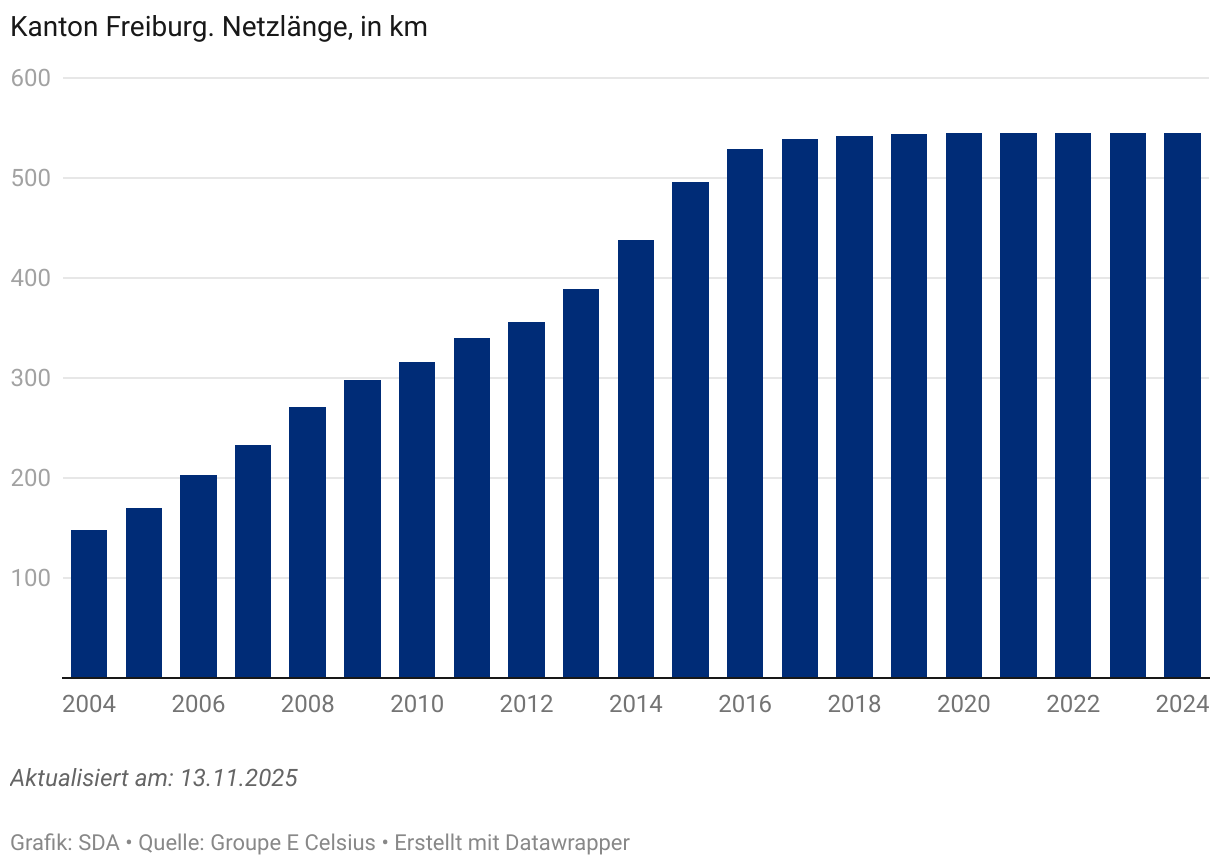 Im Jahr 2024 war das Erdgasverteilnetz im Kanton Freiburg 753 km lang. Davon entfielen 545 km (72,4%) auf Groupe E Celsius. Die Länge ihres Netzes hat von 2004 (150 km) bis 2018 (542 km) stetig zugenommen. Ab 2018 hat es sich kaum mehr verändert. Die übrigen Erdgasversorger (Unigaz, Gasverbund Mittelland, Compagnie Industrielle et Commerciale du Gaz und Cosvegaz) erreichten 2024 insgesamt 208 km (27,6%).