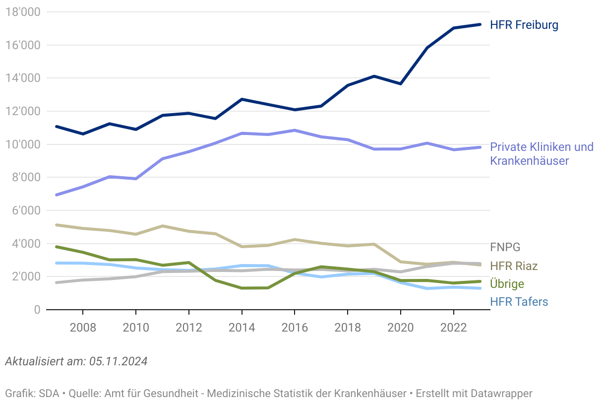 Im Kanton Freiburg standen 969 Spitalbetten zur Verfügung, zu 65,2 Prozent in Akutspitälern. 2880 Betten standen in Pflegeheimen bereit. Im Jahr 2023 wurden 37’738 Spitalaufenthalte gezählt, darunter für das Kantonsspital HFR Freiburg 17’244 Aufenthalte, was dem Höchststand seit 2007 entspricht.