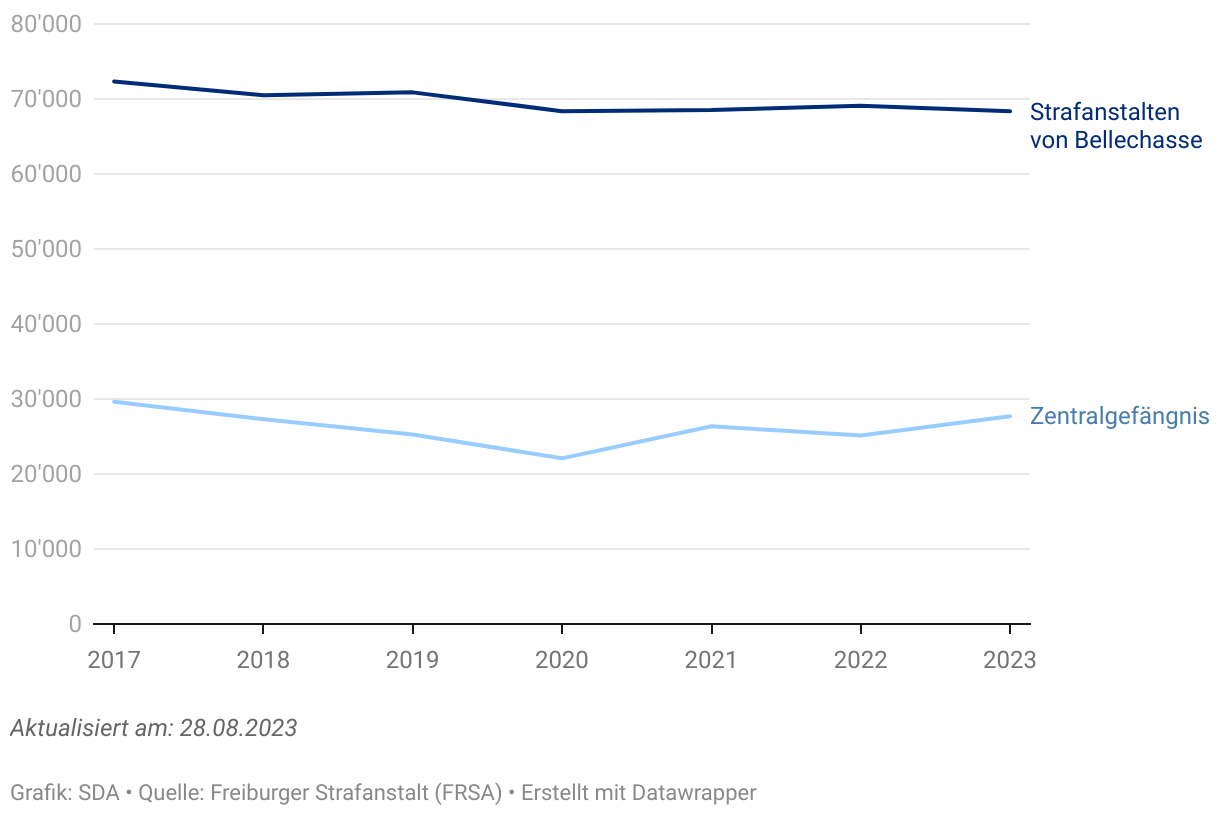 Im Jahr 2023 registrierte der Kanton Freiburg gemäss Jahresbericht der FRSA 96’089 Hafttage. Diese Zahl entspricht einer Zunahme um 2,0% im Vergleich zu 2022 (94'248 Hafttage). Seit Beginn der Datenreihe im Jahr 2017 entfallen über 70% der Hafttage auf den Standort Bellechasse, der im Laufe der Jahre einen relativ stabilen Gefangenenbestand aufweist. Demgegenüber ist die Fluktuation im Zentralgefängnis grösser, wo die Zahlen von Jahr zu Jahr stark variieren. Im Jahr 2020 wurde die bisher tiefste Zahl an Hafttagen registriert.