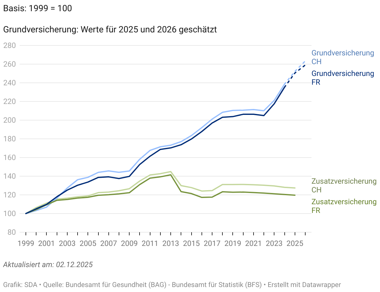 Innerhalb eines Vierteljahrhunderts sind die Prämien der Grundversicherung sowohl im Kanton Freiburg als auch auf gesamtschweizerischer Ebene um einen Faktor von über 2,5 gestiegen. Der Index der Grundversicherungsprämien nahm von 100 Punkten im Jahr 1999 auf über 250 Punkte im Jahr 2025 zu. Zum Vergleich: Der allgemeine Landesindex der Konsumentenpreise (LIK) lag im Januar 2025 17,2% höher als im Januar 1999.