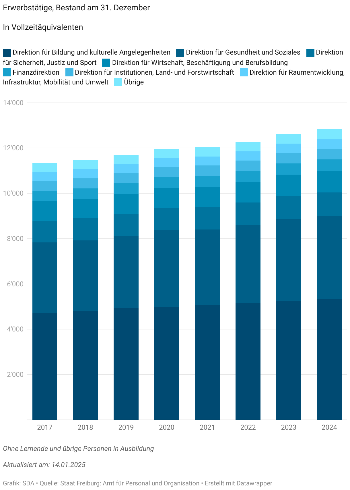 Im Jahr 2024 belief sich der Personalbestand des Staats Freiburg auf 12'839 Vollzeitäquivalente (VZÄ). In dieser Zahl sind die Lernenden und anderen Personen in Ausbildung nicht enthalten. Die Direktion für Bildung und kulturelle Angelegenheiten (BKAD) beschäftigt das meiste Personal mit 5338 VZÄ, bzw. 41,6% der gesamten VZÄ. Ihr folgt die Direktion für Gesundheit und Soziales (GSD) mit 3656 VZÄ, bzw. 28,5% des Gesamtbestands. Im Vergleich zum Vorjahr hat der Personalbestand beim Staat Freiburg um 230 VZÄ zugenommen, das sind 1,8% zwischen 2023 und 2024. Dieser Anstieg liegt im Trend der letzten 8 Jahre, wie aus der Grafik hervorgeht.