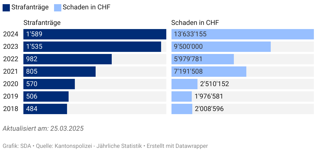 Der Kantonspolizei zufolge haben sich die Fälle von Cyberkriminalität, die in den letzten Jahren stark zugenommen haben, zwischen 2023 und 2024 stabilisiert. 2024 wurden 1589 Strafanzeigen registriert, während es im Vorjahr 1535 waren. Der finanzielle Gesamtschaden hat jedoch weiter zugenommen und erreicht 13,6 Millionen Franken gegen 9,5 Millionen im Jahr 2023.