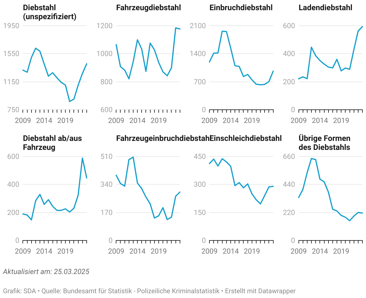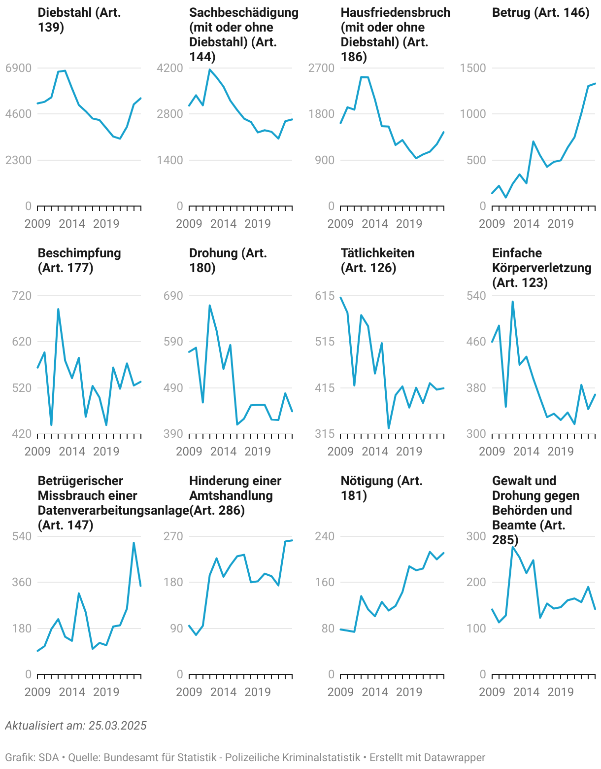 Die häufigsten Straftaten sind Diebstahl (5387) mit einer Zunahme um +5,9% gegenüber 2023, die zweithäufigsten sind Sachbeschädigung (2636, +2,1%). Der betrügerische Missbrauch einer Datenverarbeitungsanlage ist von 515 im Jahr 2023 auf 346 im Jahr 2024 gesunken.Seit Beginn der Datenreihe gibt es starke Schwankungen bei den Diebstahlzahlen. Fahrzeugdiebstähle (inkl. Velodiebstähle) bleiben besonders häufig.