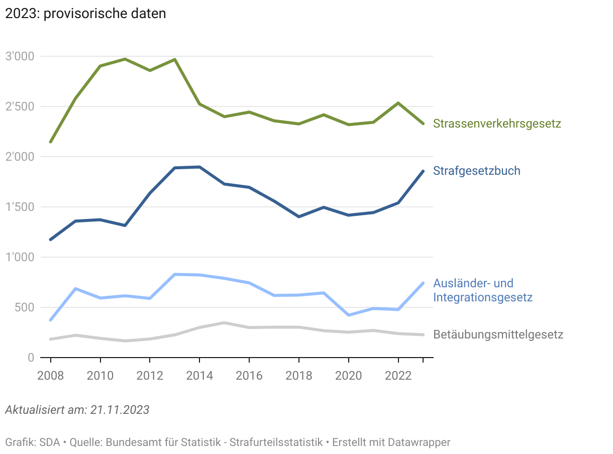 Verurteilungen nach den Verstössen gegen die wichtigsten Gesetze von 2008 bis 2023