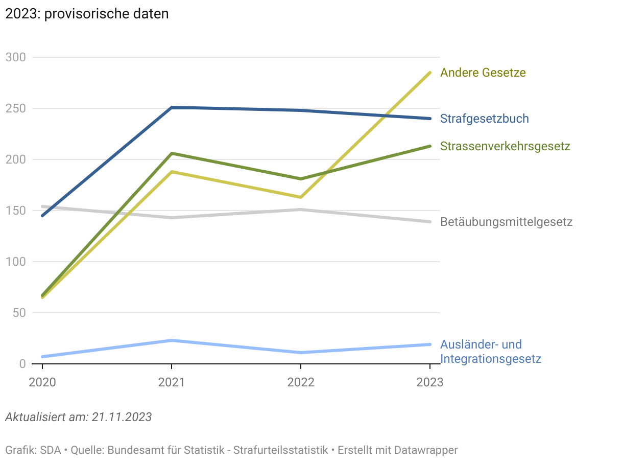 Eine Straftat kann gegen mehrere Gesetze verstossen. So kann die Gesamtsumme der Prozente höher sein als die addierten Einzelwerte der Verurteilungen.