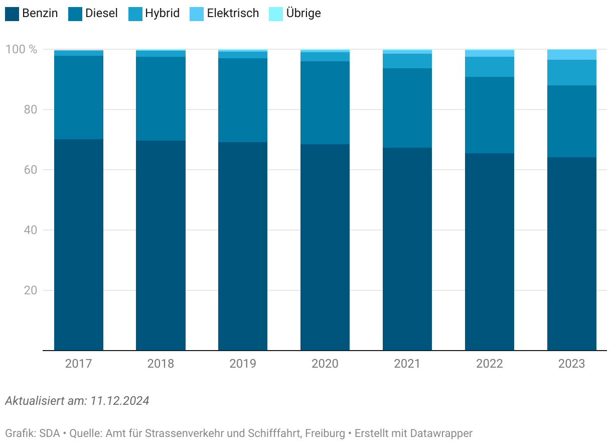 Im Jahr 2023 wurden 88,0 Prozent der 200'121 im Kanton Freiburg stationierten Personenwagen mit Benzin oder Diesel angetrieben, 12,0 Prozent mit alternativen Energieträgern. Gemeint sind hybride Antriebe, Elektrisch, Gas, Benzin/Alkohol und Wasserstoff. Diese Verteilung entspricht annähernd der Verteilung auf Landesebene. Schweizweit wurden 88,8 Prozent der Personenwagen mit Benzin oder Diesel, 11,2 Prozent mit anderen Energieträgern angetrieben. Im 6-Jahres-Vergleich hat sich der Anteil der Autos mit alternativem Antrieb im Kanton Freiburg (2,0 Prozent im Jahr 2017) um das 5,9-Fache erhöht. Insbesondere hat sich der Anteil der Hybridautos um das 5,2-Fache gesteigert und liegt nun bei 8,5 Prozent, während sich der Anteil der Elektroautos um das 15,9-Fache erhöht hat und 2023 bei 3,3 Prozent lag.