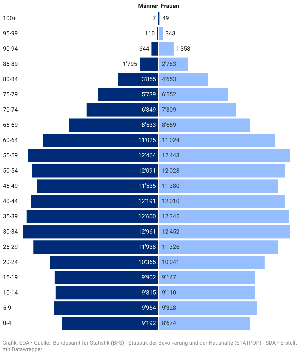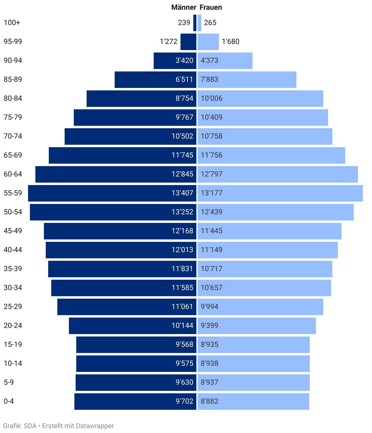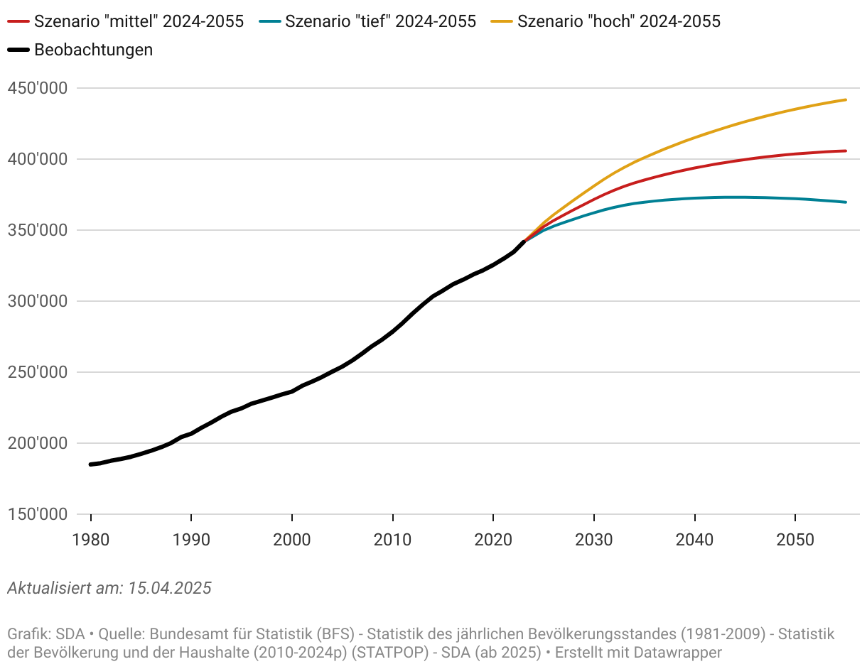 Den vom Amt für Statistik und Daten erstellten Bevölkerungsprognosen für den Kanton Freiburg zufolge wird nach dem mittleren Szenario die Bevölkerung des Kantons bis 2055 auf knapp 405'000 Einwohnerinnen und Einwohner ansteigen. Zu diesem Zeitpunkt sollte sich die Zahl der Personen im Alter ab 80 Jahren gegenüber dem Jahr 2024 mehr als verdoppelt haben. Ihr Anteil sollte also von 4,5% auf 9,4%, das heisst auf etwa 38'000 Personen, ansteigen. Das sind 20'000 Personen mehr als 2024 (15'500). Die Zahl der Hundertjährigen dürfte 400 übersteigen, während sie derzeit nur bei etwa fünfzig liegt.