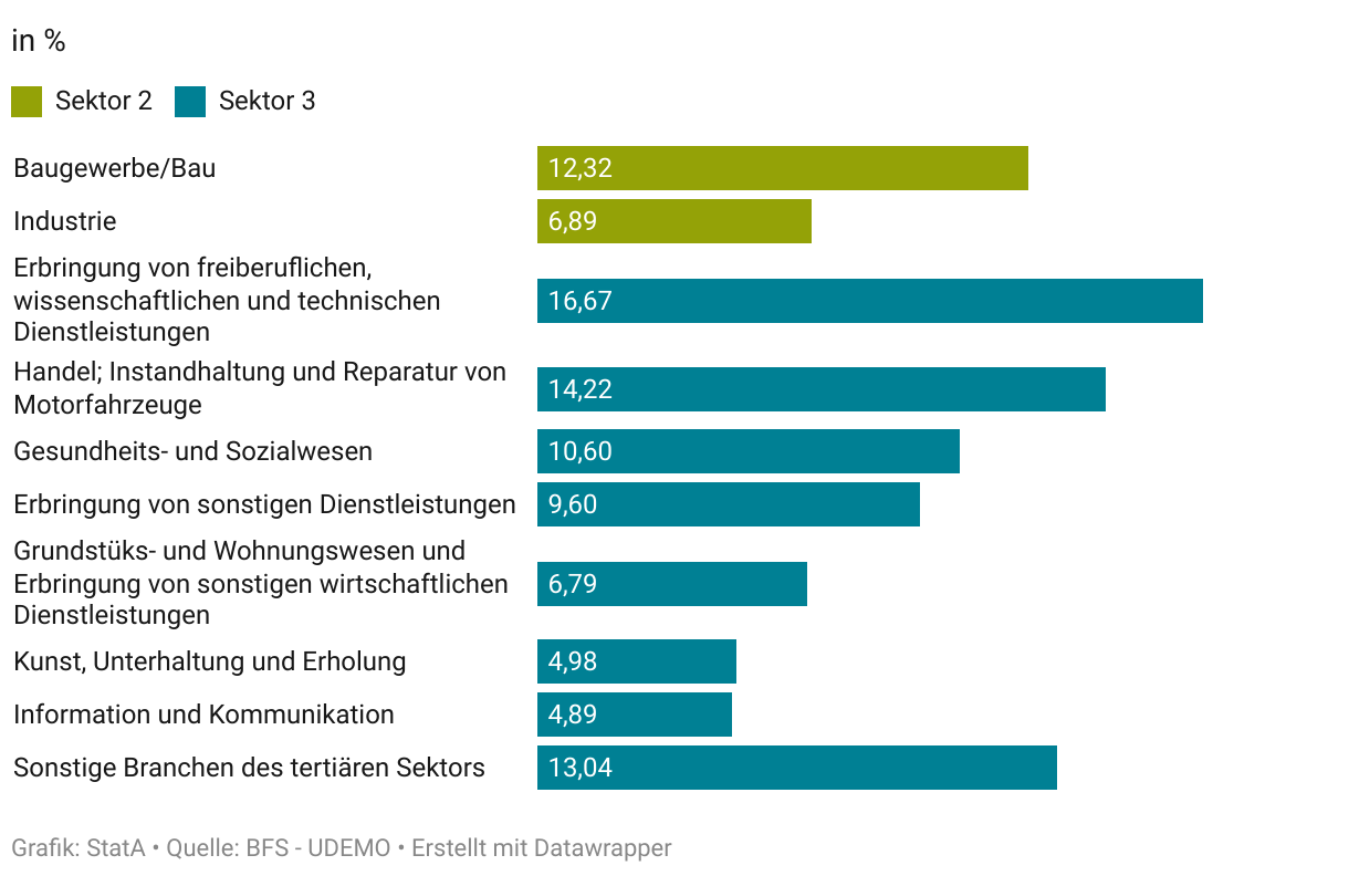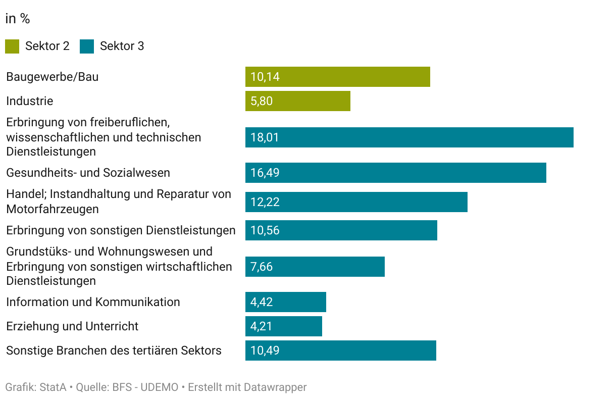 Parallelen zu den Unternehmensgründungen sind festzustellen: Die Mehrheit der Unternehmen, die geschlossen haben, waren im tertiären Sektor tätig (80,8%), insbesondere in den Branchen «freiberufliche, wissenschaftliche und technische Dienstleistungen» (16,7%), «Handel mit Motorfahrzeugen; Instandhaltung und Reparatur von Motorfahrzeugen» (14,2%) und «Gesundheits- und Sozialwesen» (10,6%).