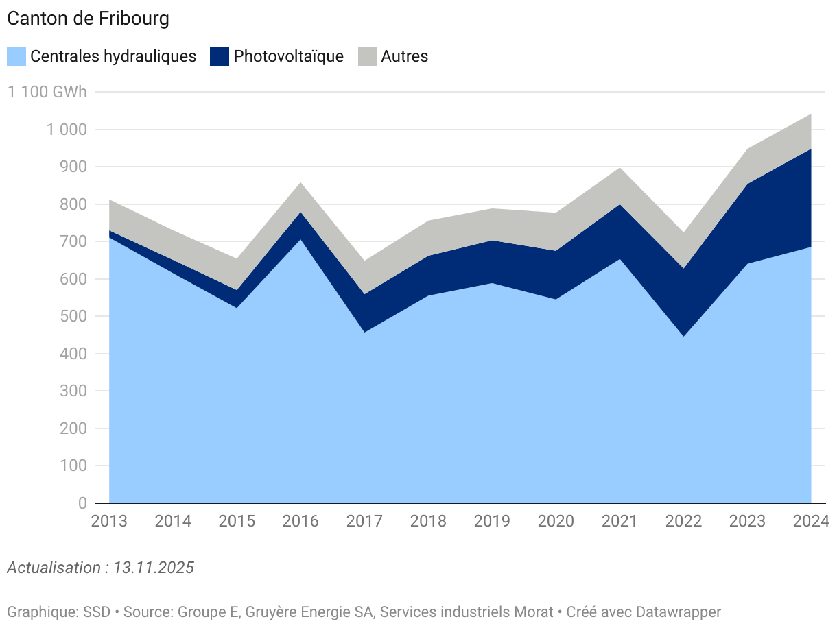 L'énergie électrique injectée par les distributeurs d'électricité fribourgeois dans leur réseau respectif en 2024 s'élève à 1'041’743 MWh. Ce chiffre est en augmentation de 9,9% par rapport à l'année précédente. L’énergie renouvelable s’élève à 1’014’179 MWh (97,4%), tandis que l’énergie non renouvelable représente 27’564 MWh (2,6%). Sa part est restée globalement stable entre 2013 (95,6%) et 2022 (95,5%), avant d’augmenter pour atteindre 97,4 % en 2024. Ce sont les centrales hydrauliques qui produisent le plus d'énergie (65,8%), suivies par les installations photovoltaïques (25,3%). Cette source est en forte augmentation. En 2013, le photovoltaïque produisait 19’340 MWh contre 263'156 MWh en 2024 ce qui équivaut à une multiplication par 14. Les usines d'incinération des ordures, les petites installations chaleur-force, les centrales de chauffage à distance et l'industrie représentent au total 8,9% de la production. Le Groupe E produit 95,5% de l'électricité du canton de Fribourg, Gruyère Energie 4,1% et les Services industriels de Morat 0,4%.
