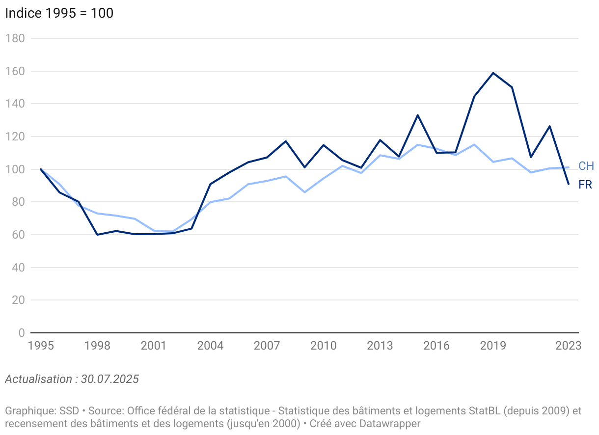 La production de logements dans les nouvelles constructions en 2023 dans le canton de Fribourg s’élève à 1803 unités et à 46'731 unités en Suisse.En 2023, l’indice de la production de logement du canton de Fribourg est inférieur de plus de 10 points à celui de la Suisse. Il faut remonter à la fin des années 1990 pour retrouver une telle situation. De 2006 à 2022, la croissance de la production de logements était très soutenue dans le canton de Fribourg (en moyenne 2350 nouvelles unités), pour la 1ère fois en 2023 elle est en baisse et se situe au même niveau que la production de 2004.Sur l’ensemble de la période, la construction de logements est dominée par les logements de 4 pièces, suivis des 3 pièces et des 5 pièces (à parts quasi égales), formant le cœur de la nouvelle offre résidentielle. Depuis 2014, la construction de logements de 3 pièces dépasse celle des 5 pièces et depuis 2016, avec un pic en 2019-2020, elle constitue la plus grande partie des logements nouvellement construits. La production de logements de 6 pièces et plus reste relativement stable avec une légère baisse depuis 2000.