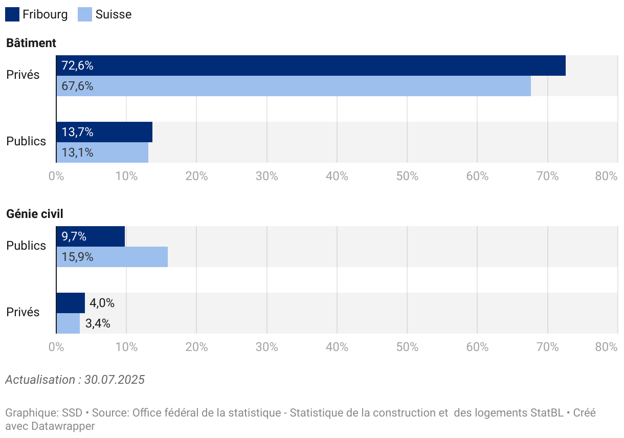 Le montant des investissements dans le canton de Fribourg en 2023 est de 2131 millions de francs, en hausse de 2,2 % par rapport à 2022 (2085 mio) pour la construction. Sur la même période, la progression pour la Suisse est de 1,4 %, passant de 60'875 mio en 2022 à 61'745 millions en 2023.En 2023 dans le canton de Fribourg, 72,6% des investissements dans la construction sont faits par des maîtres d’ouvrage privés pour la construction de bâtiments, contre 67,6% pour la Suisse. Concernant les travaux de génie civil par les maîtres d’ouvrage publics, la part des investissements pour la Suisse représente 15,9% contre 9,7% pour le canton de Fribourg.