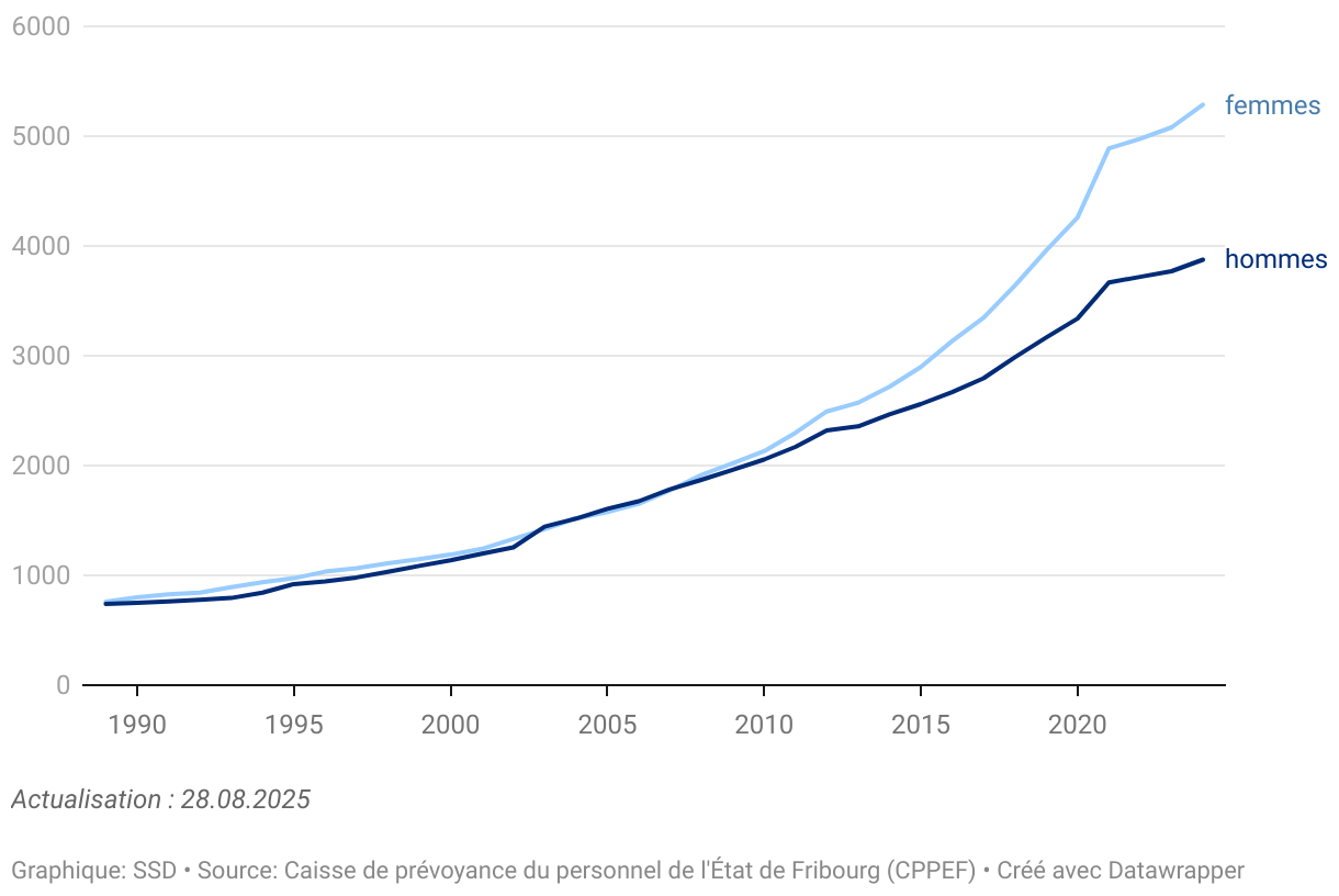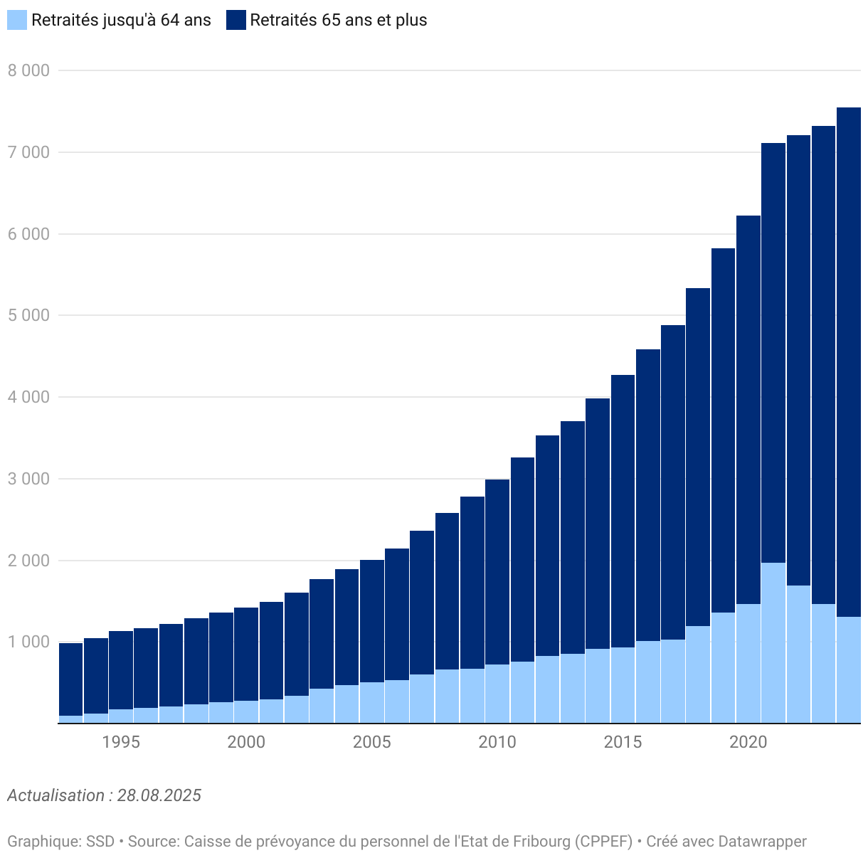 Selon les données de la Caisse de prévoyance du personnel de l'État de Fribourg, le nombre total de pensionnés a augmenté de 3,5% entre 2023 et 2024, passant de 8850 à 9161. Pendant la même période, la somme mensuelle totale des pensions a augmenté de 1,6%, passant de 21'654'961 francs à 21'995'778 francs.