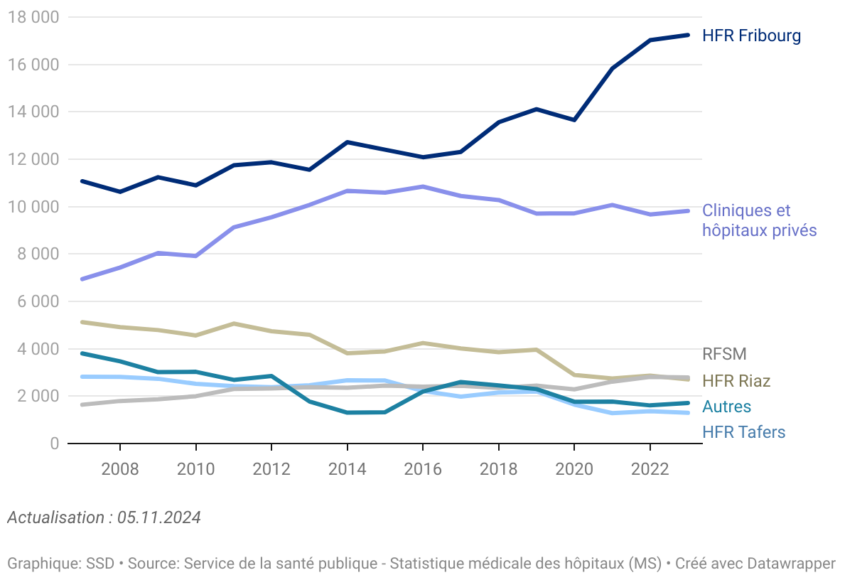 Le canton compte 969 lits hospitaliers disponibles dont 65,2% sont des lits de soins aigus. Enfin, le canton compte encore 2880 lits dans les homes médicalisés. L’année 2023 a vu un total de 37'738 séjours hospitaliers, dont un nombre record depuis 2007 pour le site hospitalier HFR Fribourg, qui a enregistré 17’244 séjours.