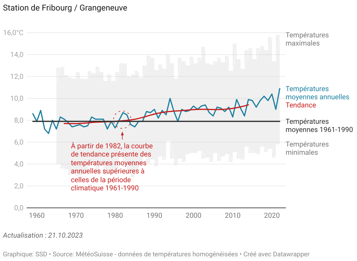 Les données homogènes de température de la station de Grangeneuve fournies par l’Office fédéral de météorologie et de climatologie MétéoSuisse montrent sur le long terme une augmentation nette des températures. La température moyenne annuelle sur la période 1961-1990 était de 7,9°C. En 2022, cette température est montée à 10,9°C, dépassant ainsi de 3,0°C la moyenne 1961-1990. Il s’agit de l’année la plus chaude. La tendance à la hausse est marquée depuis les années 1980 sur les trois indicateurs : les moyennes annuelles, les températures maximales moyennes de juillet ou minimales moyennes de janvier.