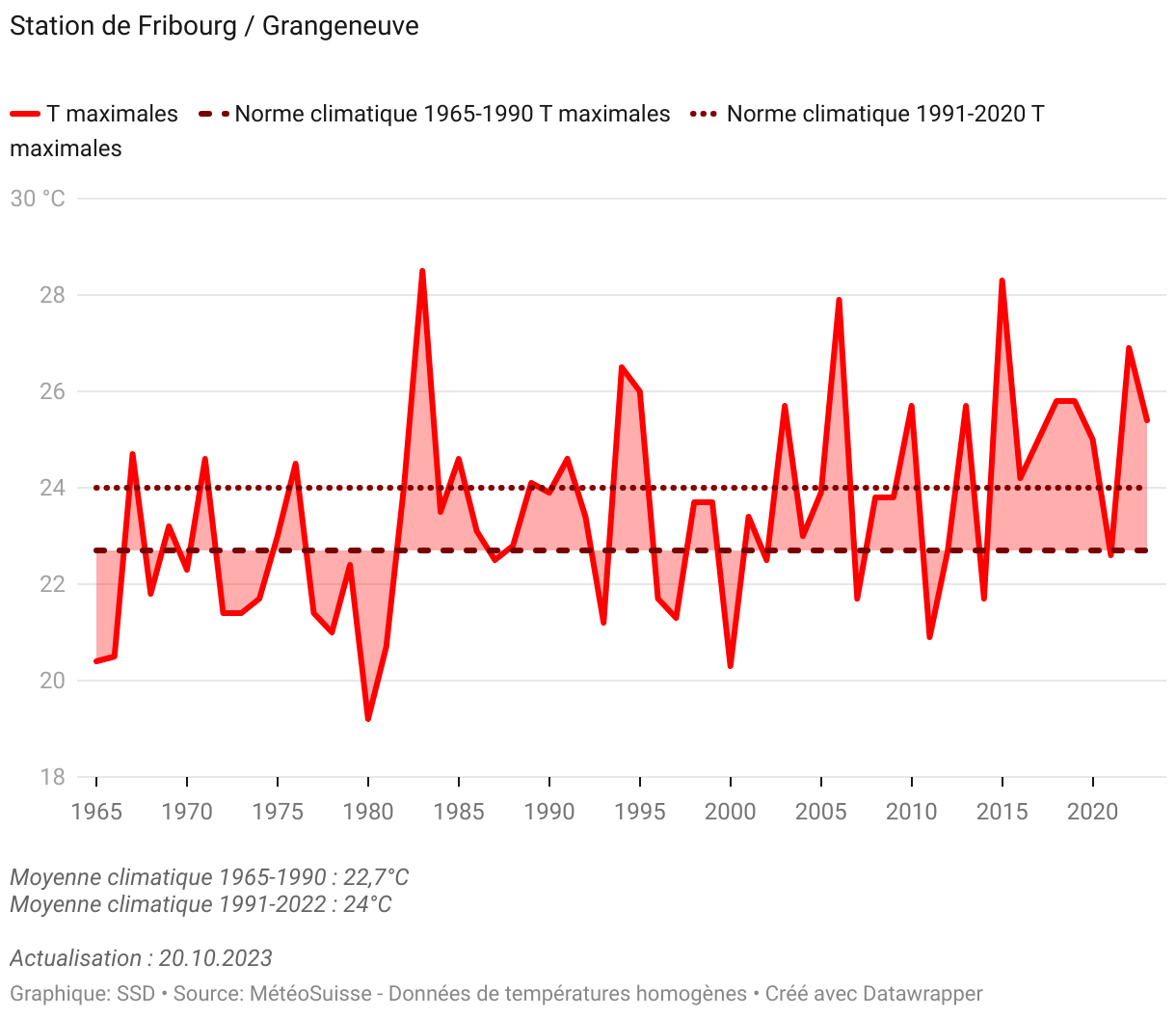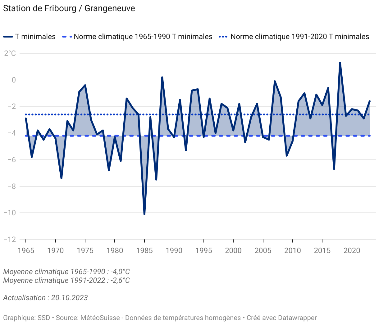 Les données de la station de Grangeneuve, dans la commune d’Hauterive ont été homogénéisées depuis 1959. Pour obtenir des informations détaillées concernant les données homogénéisées, vous pouvez consulter la page Homogénéisation des séries de mesures climatiques de l’Office fédéral de météorologie et de climatologie MétéoSuisse.