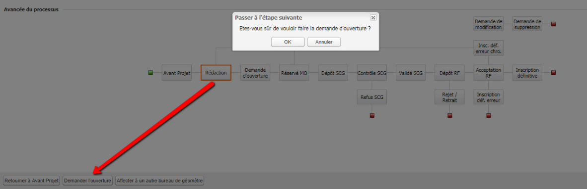 La demande d'ouverture est officiellement déclenchée en cliquant sur <OK>. Le SCG reçoit la demande dans le volet "Accueil" et y donne suite en ouvrant le job dans la BDMO si nécessaire et en acceptant l'ouverture de l'acte. Le SCG peut refuser cette ouverture en motivant le refus (Violation de la législation, conflits non résolus entre job's exigeant le report de l'ouverture, ...). Le fichier itf provenant de la BDMO est inséré par le SCG comme document technique de type "Fichier ITF en sortie" et denommé "g############.itf". Passons à la gestion des surfaces des immeubles de l'acte...