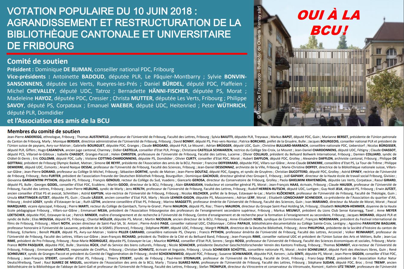 Le comité, présenté le 2 mai 2018 aux médias fribourgeois, est présidé par M. Dominique de Buman. La vice-présidence est assurée par des élus au Grand Conseil de tous les groupes politiques: Mmes Antoinette Badoud, Sylvie Bonvin-Sansonnens, Bernadette Hänni-Fischer, Madeleine Hayoz, Christa Mutter et de MM. Daniel Bürdel, Michel Chevalley, Philippe Savoy, Emanuel Waeber, Peter Wüthrich.