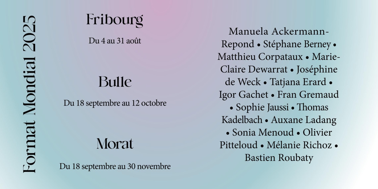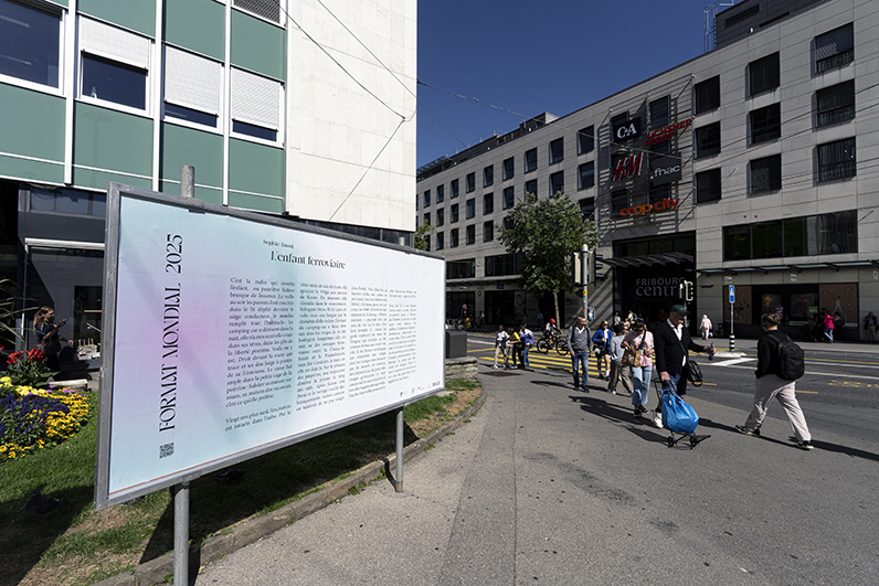 Après trois éditions dédiées aux arts visuels, Format Mondial met cette année en lumière la littérature. Ce printemps, plus d'une quarantaine d'auteurs et d'autrices professionnel-les fribourgeois-es ont proposé leur contribution sur la thématique "Voyages". Le jury a sélectionné quinze textes - poèmes, nouvelles, textes en prose, haïkus et autres formes diverses - à découvrir en plein air, le long d'un itinéraire en ville de Fribourg (ouvrir la carte interactive) . L'exposition se poursuivra à Bulle et à Morat, dès le 18 septembre.