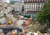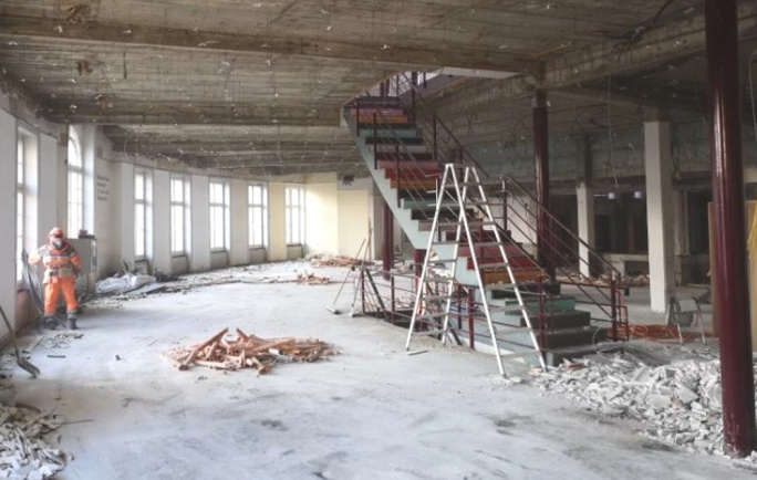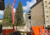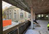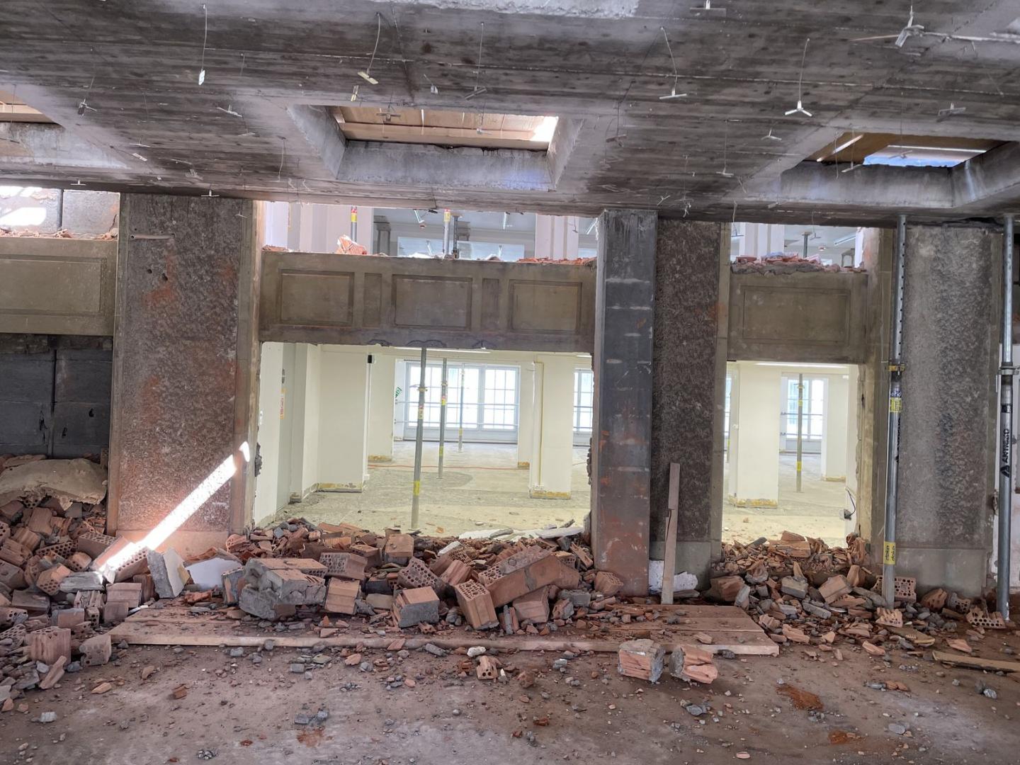 De mars à juin, les travaux ont été bien entamés. Les démontages intérieurs sont arrivés à terme et la démolition de la partie du bâtiment datant de 1976 a commencé. À la Rue Saint-Michel, une charpente métallique externe est en phase de montage dans le but de soutenir temporairement la façade historique, ceci en vue de la rénovation des structures internes et de la creuse sous cette partie du bâtiment.