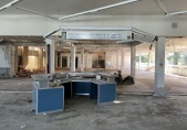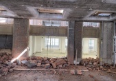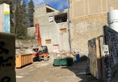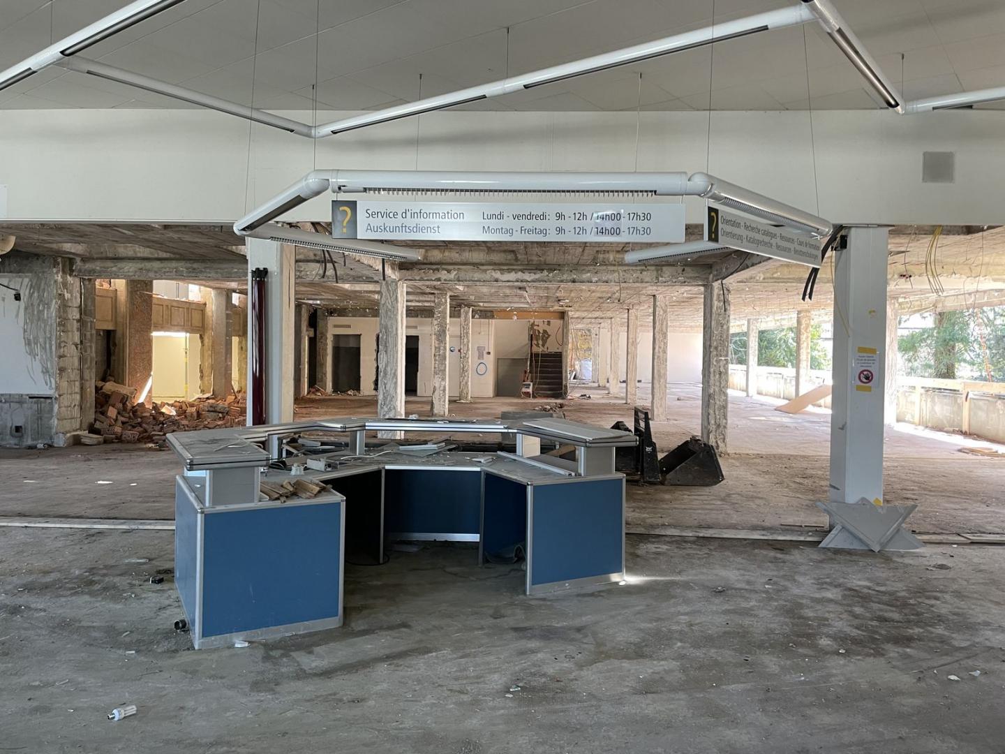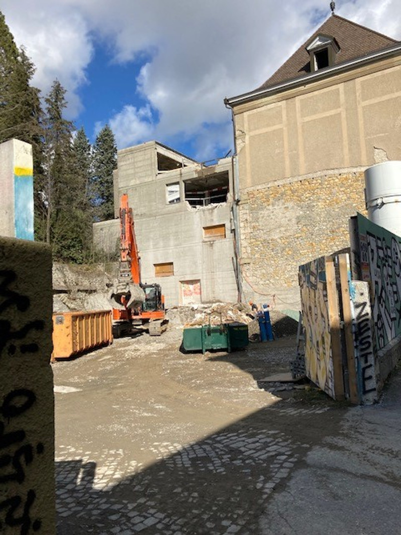 Après les démontages, une phase importante a été le désamiantage, qui permettra la démolition d’une partie du bâtiment de la BCU qui datait de 1976, situé derrière les locaux historiques de 1910 de la Rue St-Michel, en face du café Le Populaire. Notez que deux ouvertures ont été faites dans la façade du bâtiment donnant sur le terrain vague (ouvrant littéralement l’ancien cabinet des manuscrits à l’air libre), ceci dans le but d’évacuer les différents matériaux : étagères fixes des anciens magasins, mobilier et gravats.