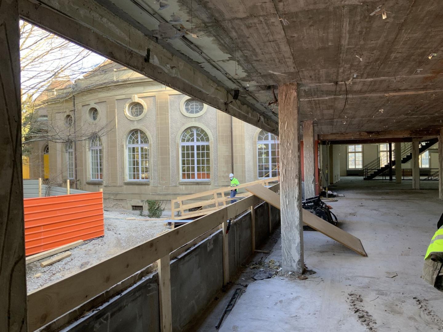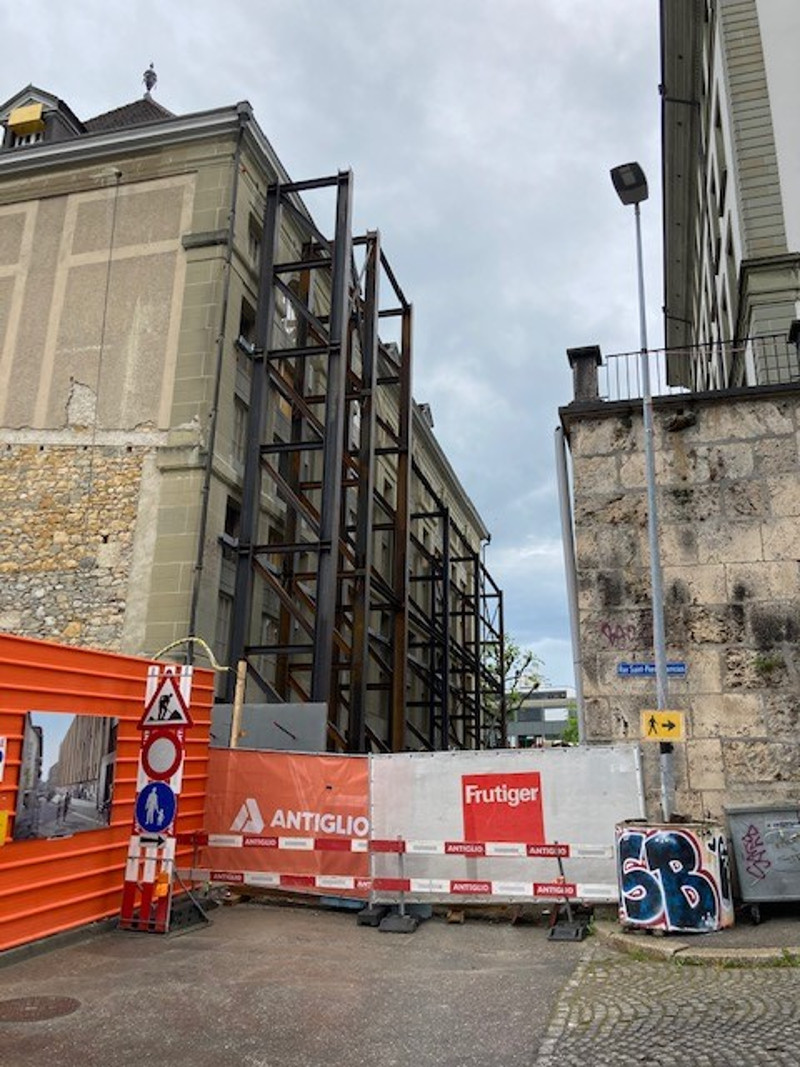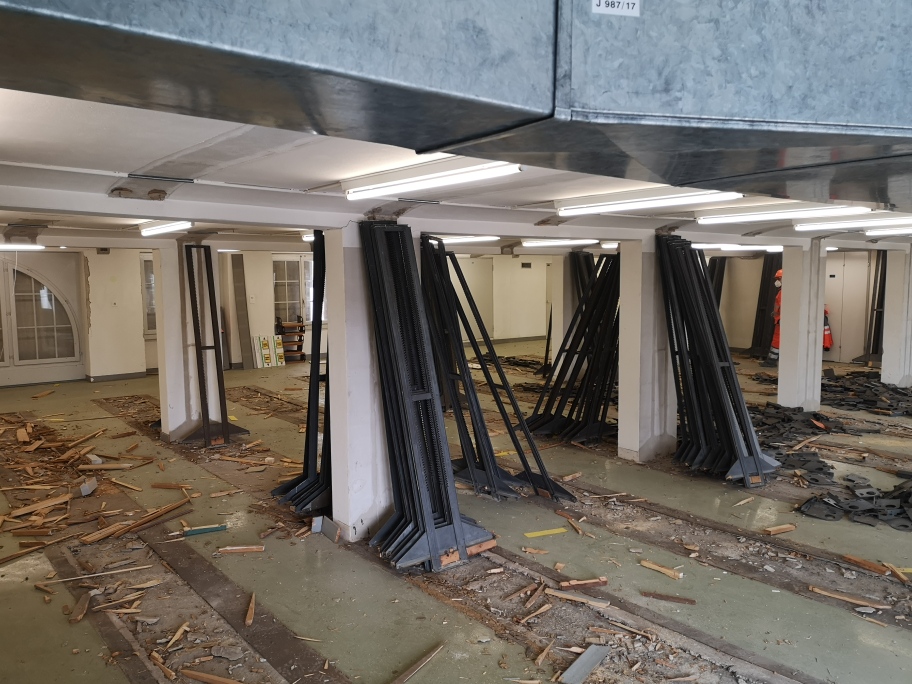 C’est ainsi que la métamorphose a réellement débuté en janvier 2021 par la pose d’une palissade orange tout autour du bâtiment qui protègera le chantier et assurera la sécurité des passant·e·s pour les années à venir. Les entreprises ont pris possession du bâtiment, une bande de terrain du jardin des Dominicains à l’arrière du bâtiment a été défrichée et des sondages ont eu lieu pour déterminer la nature exacte du sol en vue de la creuse du terrain qui descendra jusqu’à 19 mètres de profondeur. Cet espace en sous-sol accueillera le stockage d’un million de documents. Le démontage du mobilier fixe a alors commencé : notamment toutes les étagères des anciens magasins datant en grande partie de 1910 !