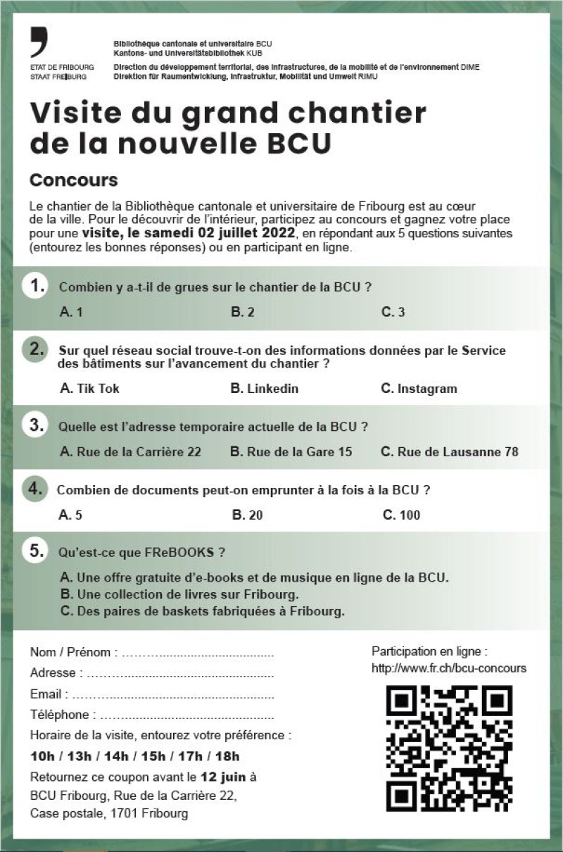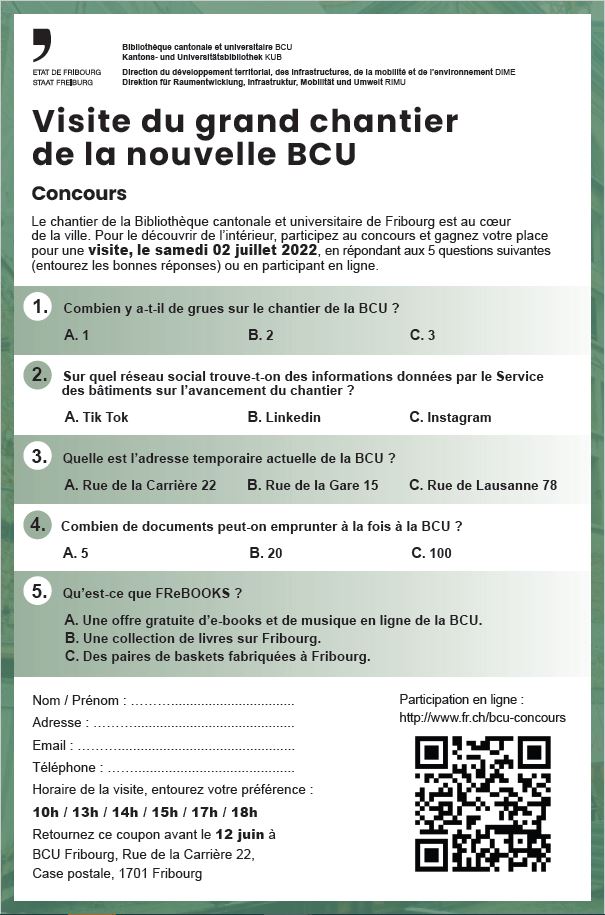Votre BCU est en travaux depuis maintenant plus d’un an au cœur de la ville. Il est temps d’ouvrir les portes du chantier et vous proposer une visite publique le 2 juillet 2022. Un concours est lancé pour sélectionner les participants ! Pour découvrir le chantier de l’intérieur, participez au concours et gagnez votre place en répondant aux 5 questions du quiz en ligne ! : www.fr.ch/bcu-concours