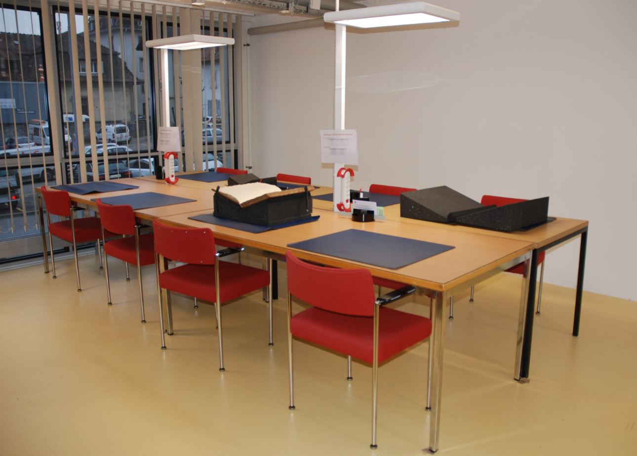 - L’usager veille à manipuler les documents avec le plus grand soin en faisant usage du matériel de consultation mis à sa disposition (coussins, serpents, etc.) et en n’utilisant que le crayon pour prendre notes. Des casiers sont à disposition à l’entrée.