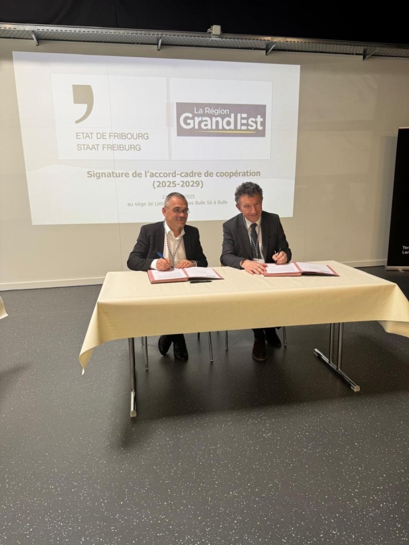 L’accord a été signé aujourd’hui au siège de Liebherr Machines SA à Bulle. Le Groupe Liebherr est un employeur important dans la Région Grand Est avec trois sites de production à Colmar et une société de service et de distribution à Niederhergheim. Cela symbolise aussi l’interdépendance et les bonnes relations entre nos deux régions. Le renouvellement de cet accord de collaboration témoigne de l’importance de pouvoir compter sur une région alliée au sein de l’Europe.