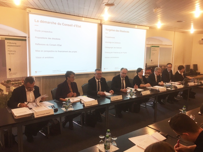 Innovation, renforcement du centre cantonal et digitalisation: tels sont les maîtres-mots du Gouvernement fribourgeois, qui a présenté ce matin son programme de législature et son plan financier 2017-2021. Préparé depuis plusieurs mois, ce programme met en exergue trois projets phares - Fribourg s'impose comme un pôle économique et d'innovation, Fribourg renforce le centre cantonal, Fribourg fait sa révolution 4.0 - qui vont influencer le visage du canton, non seulement durant cette législature, mais assurément bien au-delà. Ces projets phares sont essentiels pour l'avenir et leurs retombées bénéficieront à toutes les activités. Si leur réalisation ne dépend pas toujours d'une décision du Gouvernement, ce dernier joue un rôle moteur dans les conditions cadres à leur réalisation, dans les impulsions de départ ainsi que dans le suivi. Pour concrétiser les projets phares et pour poursuivre les nombreuses autres activités nécessaires au bien-être de la population et au développement du canton, le Conseil d'Etat a construit son programme de législature sur trois ambitions. Ces ambitions, déclinées chacune en six chantiers, sont les suivantes : favoriser l'emploi, moderniser le canton et améliorer la qualité de vie.