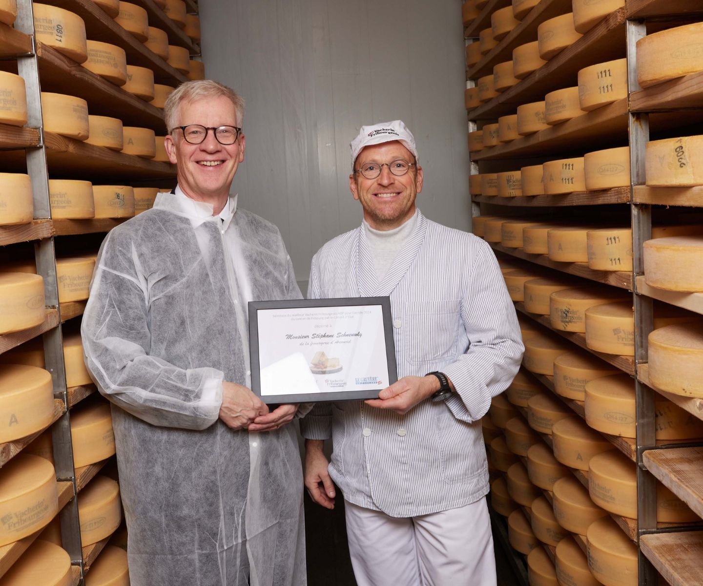 Au nom du Conseil d’Etat, le président Jean-Pierre Siggen a remis cette semaine les deux distinctions du meilleur Gruyère AOP et du meilleur Vacherin Fribourgeois AOP pour l’année 2024 du canton de Fribourg. Elles ont été décernées au Gruyère AOP produit par Benoît Deforel, de la fromagerie de Sâles, et au Vacherin Fribourgeois AOP fabriqué par Stéphane Schneuwly, de la fromagerie d’Arconciel. Ces deux fromagers auront le droit de mentionner le fait que leur produit a été sélectionné par le Conseil d’Etat pour ses réceptions durant une année.
