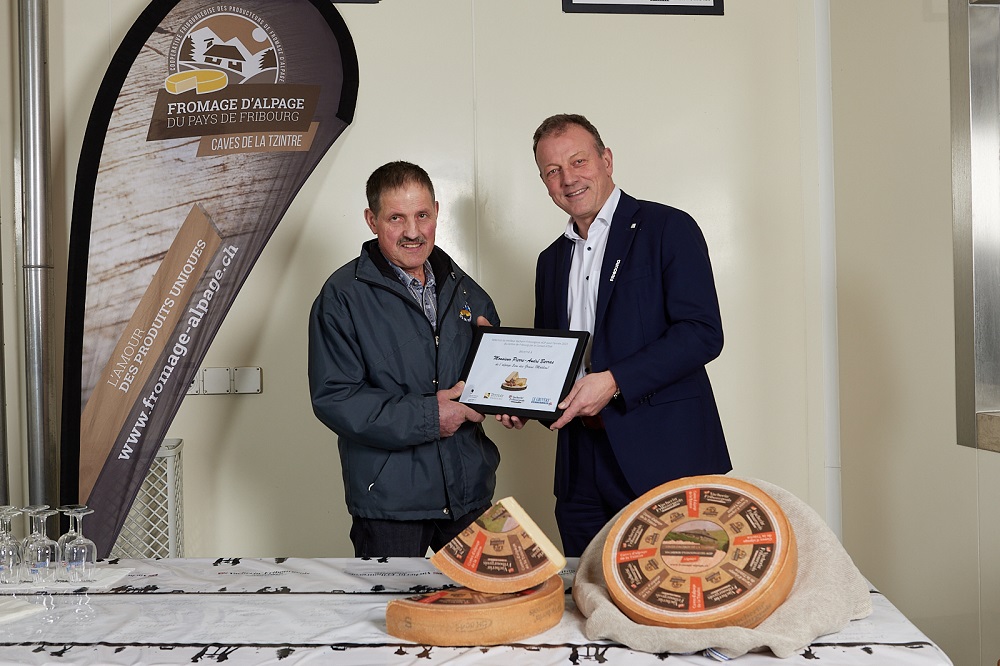 Au nom du Conseil d’Etat, le président Didier Castella a remis cette semaine les deux distinctions du meilleur Gruyère AOP et du meilleur Vacherin Fribourgeois AOP pour l’année 2023 du canton de Fribourg. Elles ont été décernées au Gruyère AOP produit par Alexandre Tinguely, Maître fromager à la fromagerie d’Ursy, et au Vacherin Fribourgeois AOP fabriqué par Pierre-André Barras, fabricant d’alpage au 3em des Groins, dans la vallée du Motélon. Ces deux fromagers auront le droit de mentionner le fait que leur produit a été sélectionné par le Conseil d’Etat pour ses réceptions durant une année.