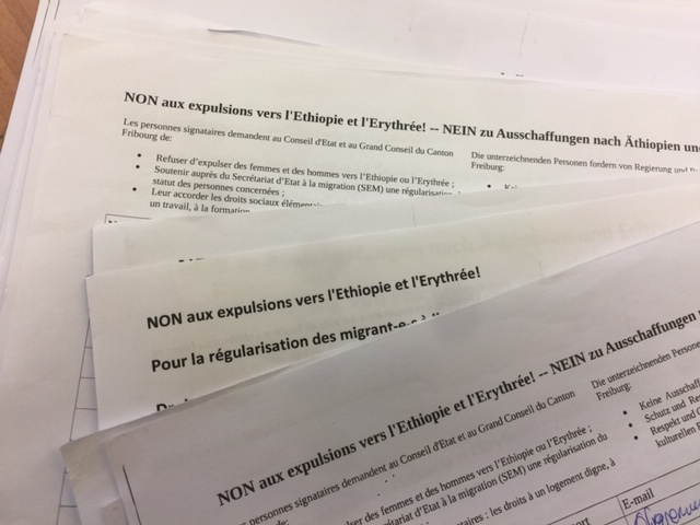 La Chancellerie d'Etat du canton de Fribourg a reçu ce matin une pétition émanant du groupe Coordin’action Fribourg Solidaire intitulée « NON aux expulsions vers l’Ethiopie et l’Erythrée ! ». Il demande au Conseil d’Etat et au Grand Conseil de refuser d’appliquer toute expulsion vers l’Ethiopie ou l’Erythrée, de soutenir auprès du Secrétariat d’Etat à la migration une régularisation du statut des personnes concernées et que le Grand Conseil leur accorde les droits sociaux élémentaires. La pétition est munie de 2374 signatures.