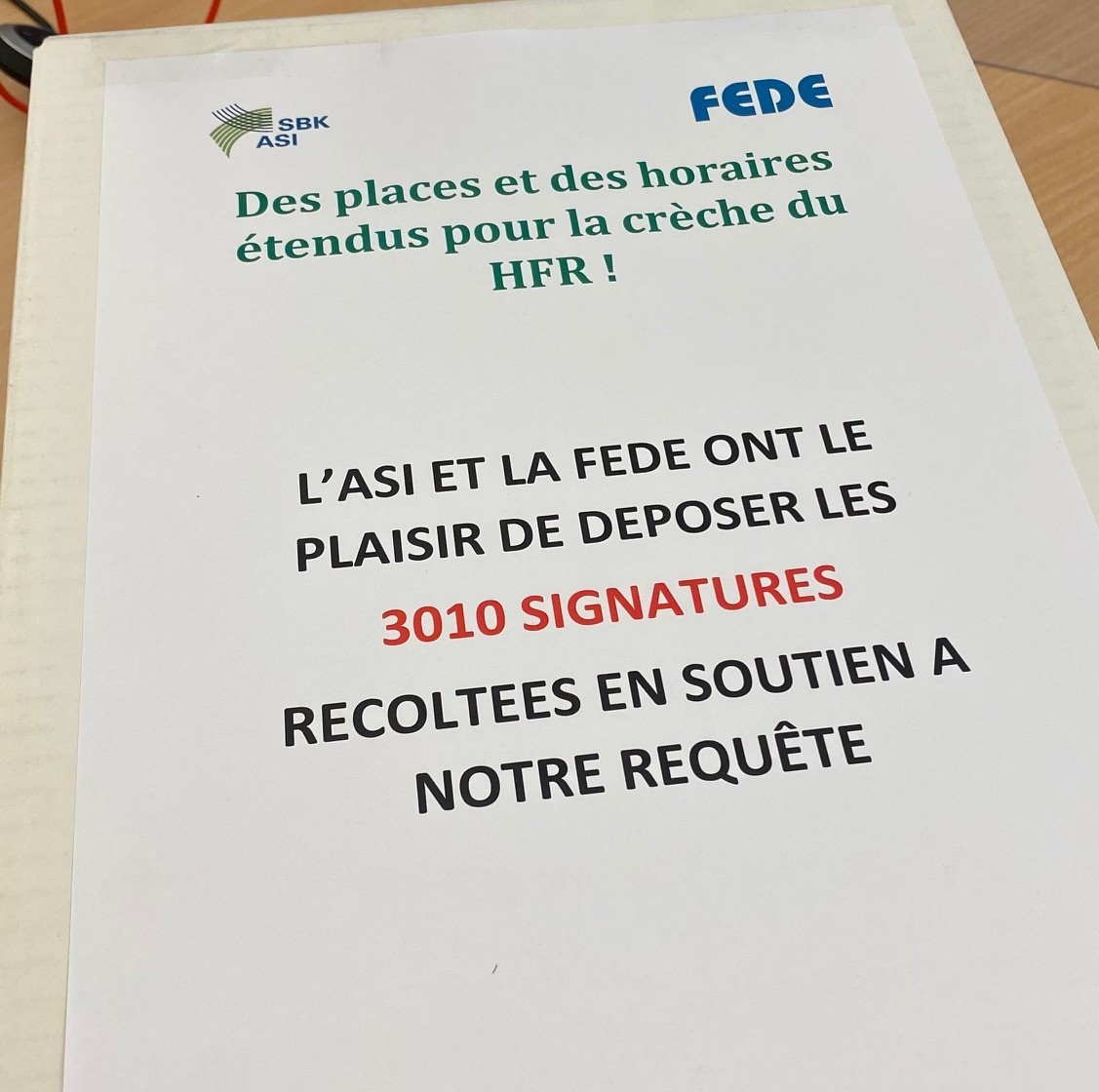 La Chancellerie d’Etat du canton de Fribourg a reçu ce matin une pétition émanant de la Fédération des Associations du Personnel du Service public du canton de Fribourg FEDE-FOPI et de l’Association Suisse des Infirmières et Infirmiers, Section Fribourg (ASI). Elle demande que le Conseil d’État présente un projet pour le financement de 20 places de crèches supplémentaires dédiée au HFR et pour l’extension des horaires de prise en charges des enfants de 06h00 à 20h00.