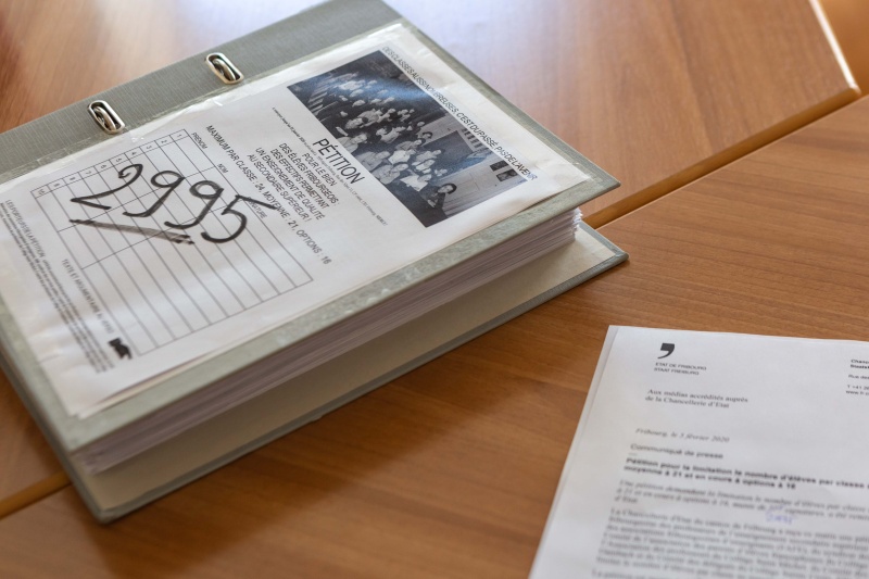 La Chancellerie d'Etat du canton de Fribourg a reçu ce matin une pétition émanant de l’Association fribourgeoise des professeurs de l’enseignement secondaire supérieur (AFPESS), de la Fédération des associations fribourgeoises d’enseignants (FAFE), du syndicat des services publics (SSP), du Comité de l’association des parents d’élèves francophones du Collège Sainte Croix, de l’Association des professeurs du Collège Saint Michel, du Comité des professeurs du Collège de Gambach et du Comité des délégués du Collège Sainte Croix. Elle demande au Conseil d’Etat de limiter le nombre d’élèves par classe au maximum à 24, en moyenne à 21 et en cours à options à 16.