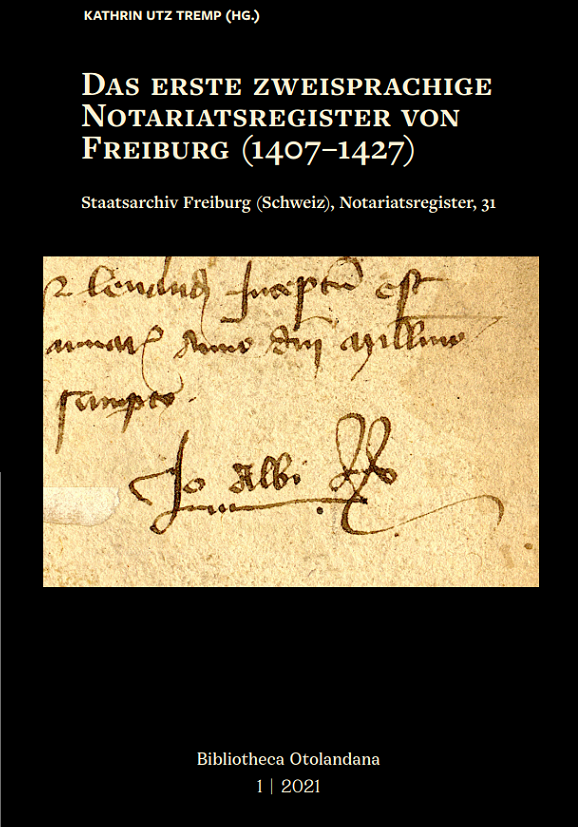 Référence : Das erste zweisprachige Notariatsregister von Freiburg (1407-1427), éd. Kathrin Utz Tremp, Fribourg, 2021, 676 pages.
