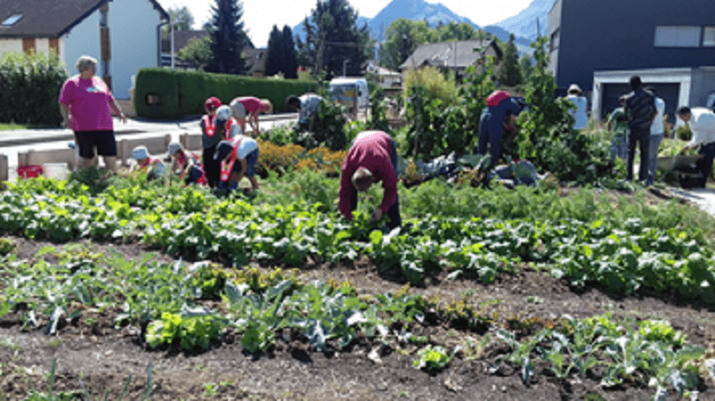 Une fois par semaine, un groupe de jardiniers en herbe se rencontre pour partager un moment agréable au jardin, échanger des connaissances, partager un goûter et participer à un atelier de sensibilisation à la santé. Le groupe se compose d’habitantes et habitants de la commune, d’enfants de l’école et de la crèche et/ou de résidents d’institutions voisines (EMS, foyer de requérants).