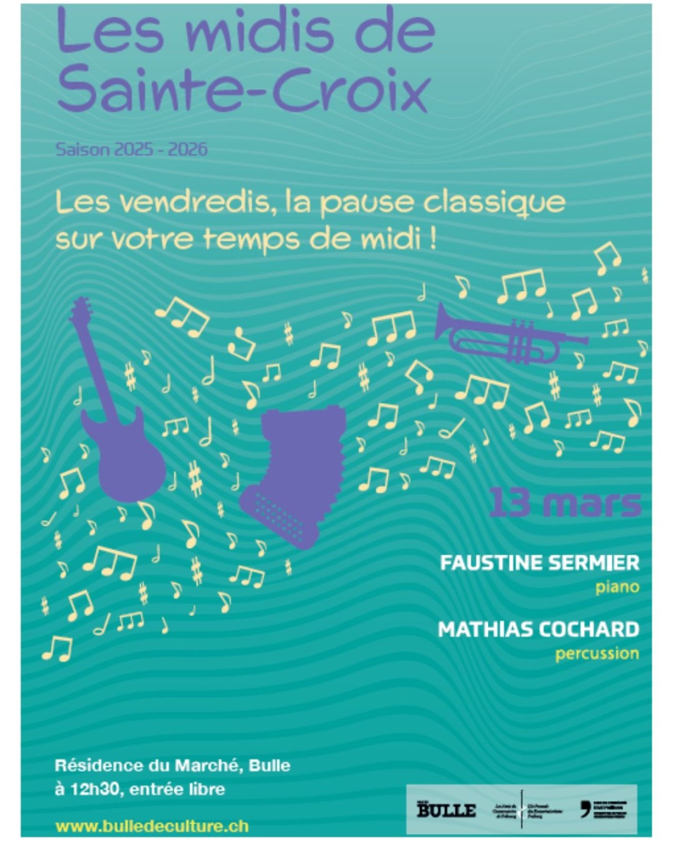 Quatrième date pour la saison des Midis de Sainte-Croix : nous aurons le plaisir de pouvoir écouter Faustine Sermier (piano), Mathias Cochard (Percussion) pour un concert sur la pause de midi.