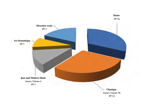 Suivent des cours au Conservatoire. (4’100 suivent des cours de musique, 69 de danse et 46 d’art dramatique)