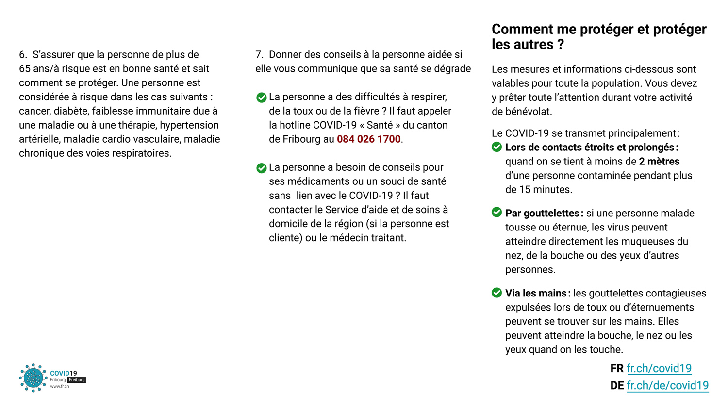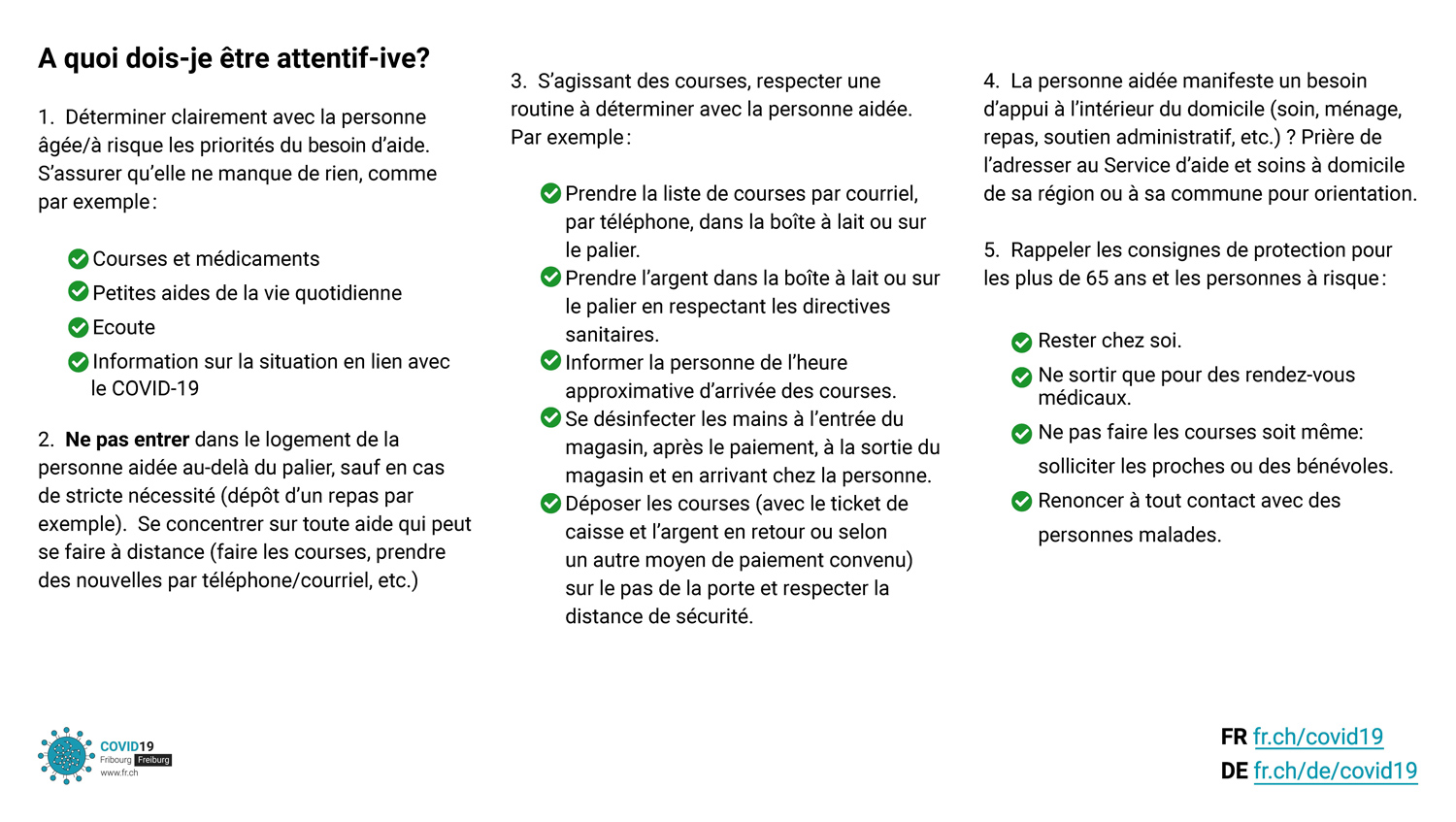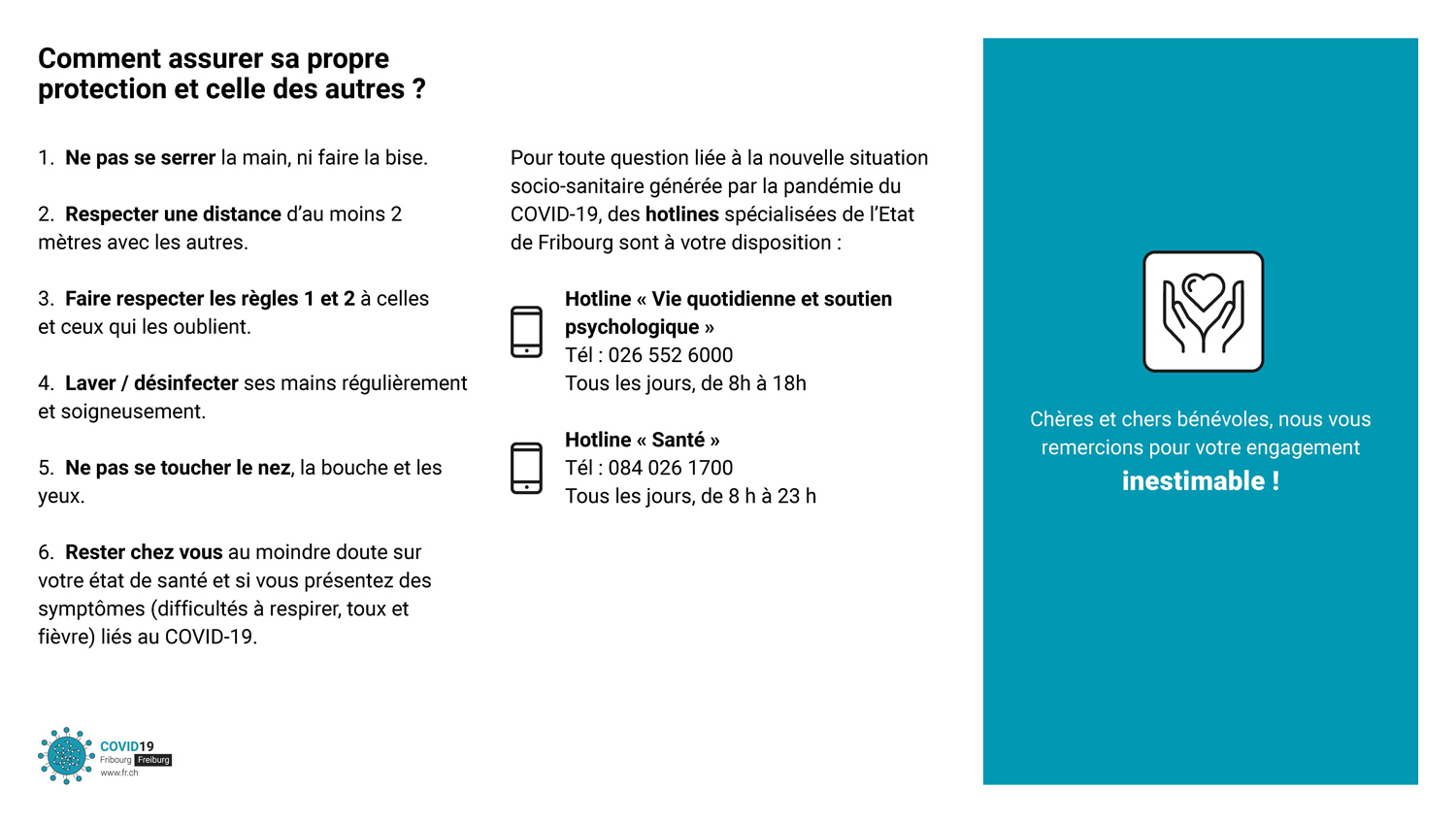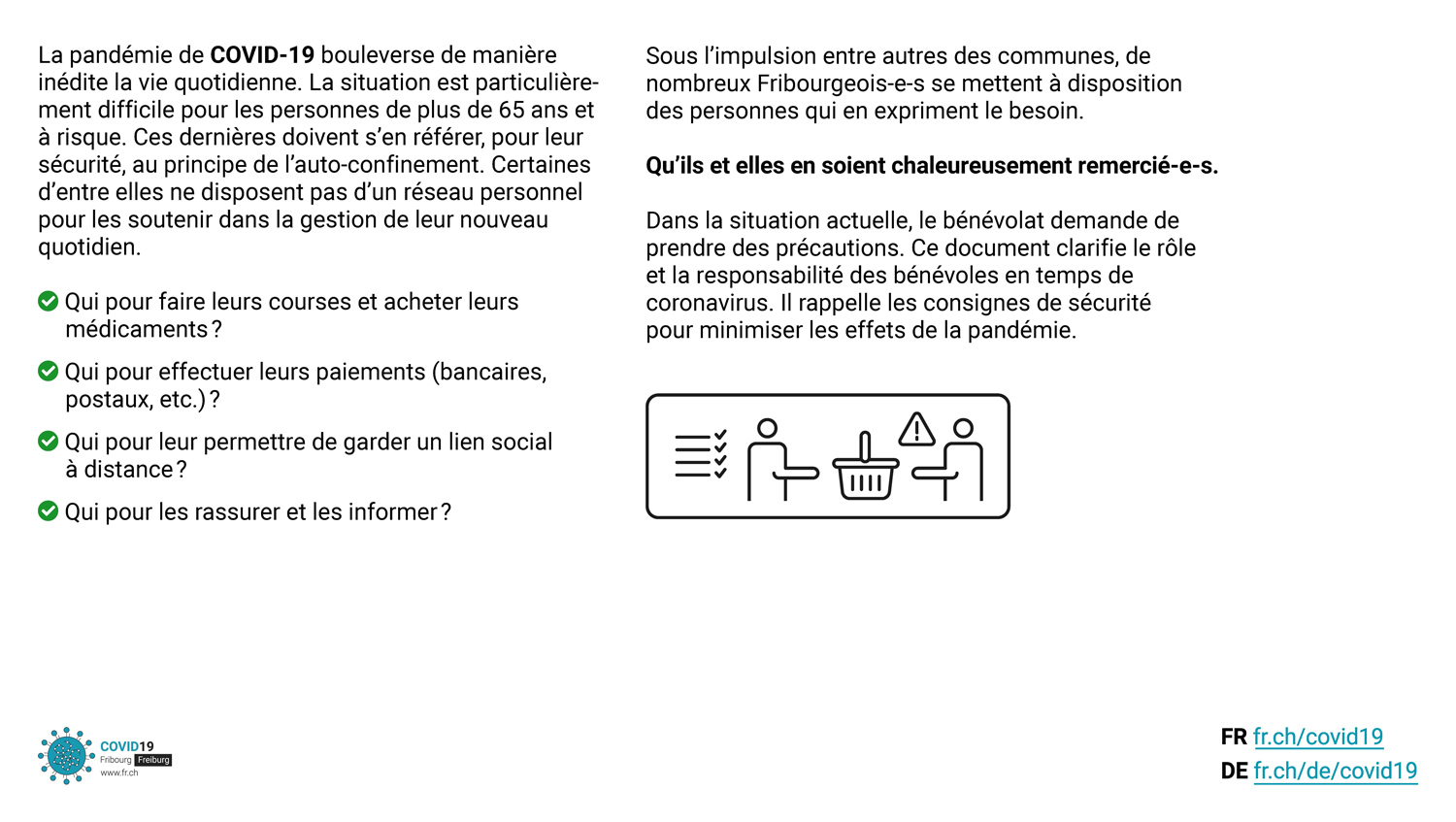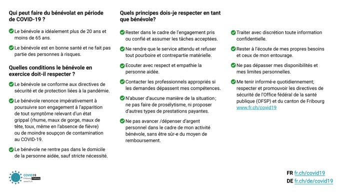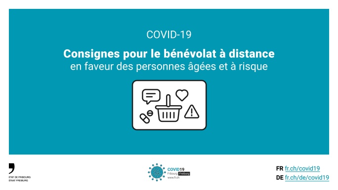 Sous l’impulsion entre autres des communes, de nombreux Fribourgeois-e-s se mettent à disposition des personnes qui en expriment le besoin. Qu’ils et elles en soient chaleureusement remercié-e-s.
