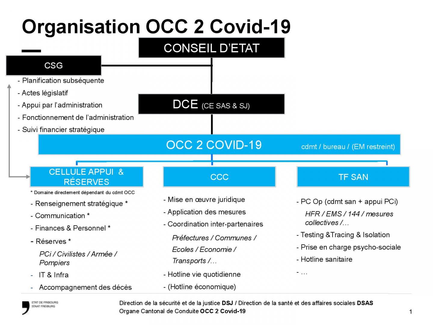 La situation en lien avec le coronavirus évolue rapidement en Suisse, et le canton de Fribourg subit, comme ses voisins, une augmentation très importante du nombre de cas ces dernières semaines. Compte tenu de l'évolution de l'épidémie sur les plans international, national et cantonal, le Conseil d'Etat déclare le territoire cantonal en état de situation extraordinaire et décide de remettre sur pied l'Organe cantonal de conduite (OCC). Il a également sollicité l’appui subsidiaire de l’armée, afin de soutenir le HFR. Aux côtés des militaires, la protection civile fribourgeoise renforcée d’un détachement de la protection civile vaudoise et de civilistes sera également à l’oeuvre dans le canton de Fribourg. Enfin, il a délégué à la Direction de la santé et des affaires sociales et à la Direction de la sécurité et de la justice la compétence de préparer les mesures urgentes utiles.
