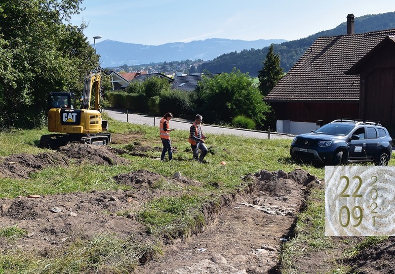 Des sondages préalables à la construction d’une maison ont livré de nombreux tronçons de murs d’époque romaine bien conservés, que les archéologues ont documentés sur place. La présence d’une villa romaine était soupçonnée à cet endroit, suite à la découverte en prospection de fragments de terre cuite. En outre, des murs visibles par temps sec dans le pré avaient été signalés par le propriétaire du terrain. Des fouilles seront réalisées avant la construction de la villa, afin de dégager et documenter ce bâtiment à peine effleuré.